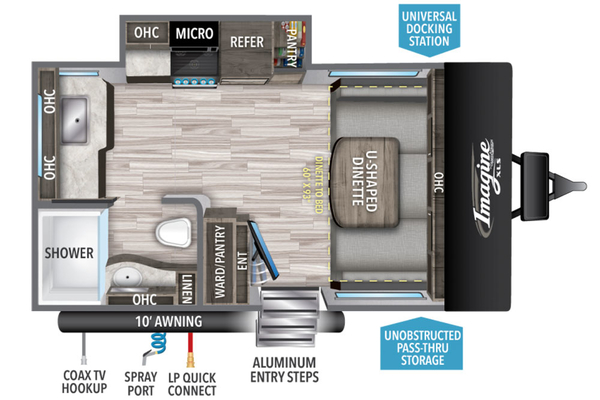 The Imagine XLS 15FLE is an all new offering from Grand Design. With a total length less than twenty feet, this trailer is easy to pull and easy to store, but loaded with features! Dual axles add stability for comfortable towing. There is a full bathroom with large step-in shower and roomy vanity, and you'll be amazed by the kitchen with surprising counter space and large deep drawers for storage. The large U-dinette folds down to a queen bed. Come see this amazing little trailer today!