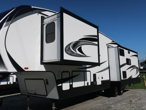 Luxury, value, and towability is what you will find in every one of these Reflection fifth wheels and travel trailers by Grand Design! The mandatory Arctic 4-Seasons Protection package allows you to camp all year round with the 35k BTU high capacity furnace, the Thermofoil insulation, and the heated and enclosed underbelly with circulating heat. Their gourmet kitchens have everything you will need to create home cooked meals including a deep, seated stainless steel sink with a high rise faucet with a pull down sprayer to make clean up easier too. The ductless flooring means there are no floor vent covers to collect dirt or debris, and the universal docking station is an all in one heated location with an EZ winterization system. Easily open the pivoting AXISTEP which will help eliminate debris and moisture from falling inside the unit and also goes all the way down to the ground to make it more stable when entering. Start your next camping trip in true luxury!