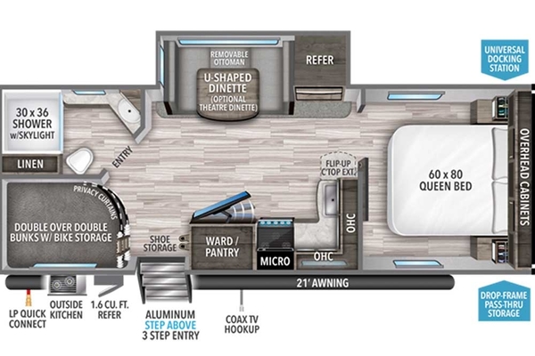 What an amazing bunkhouse! Less than 6,000 pounds dry, and less than 29' total length make the Imagine 2400BH easy to tow, but don't let the small size fool you, this trailer has plenty of space! The bottom double bunk folds up to make room for bike storage, and there is shoe storage next to the entrance to cut down on clutter. The kitchen has three deep drawers and plenty of cabinets, and there is a large cabinet that can be used as a wardrobe or a pantry. The front bedroom has a residential queen size bed and dual wardrobes and the bathroom is equipped with an extended vanity top and spacious shower. You'll also love the solid-step aluminum steps and nicely equipped outdoor kitchen. Come see this fantastic small-but-spacious bunkhouse travel trailer today!