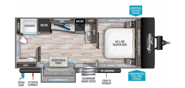 Air Conditioning +Air Conditioning (BTUs)15000Air Conditioning TypeAutomaticAwning +Awning Length (ft)18Number of Awnings1Power Retractable AwningBathroom +Bathroom Flooring TypeVinylBathroom LocationRearNumber Of Bathrooms1Bathroom Medicine Cabinet +Bathroom Medicine Cabinet LocationRearBathroom Mirror +Bathroom Mirror LocationRearBathroom Sink +Bathroom Sink LocationRearBathroom Vent / Fan System +Bathroom Vent / Fan System LocationRearBattery +Battery Power ConverterBeds +Max Sleeping Count4Number Of Queen Size Beds1Brakes +Front Brake TypeNot ApplicableRear Brake TypeElectric DrumConstruction +Body MaterialAluminumSidewall ConstructionFiberglassDimensions +Height (in)130Interior Height (in)78Length (ft)25'11"Doors +Number of Doors1Emergency Exit(s) +Number Of Emergency Exits1Heater +Heater (BTUs)25000Heater TypeAutomaticHolding Tanks +Number Of Black Water Holding Tanks1Number Of Fresh Water Holding Tanks1Number Of Gray Water Holding Tanks1Total Black Water Tank Capacity (gal)37Total Fresh Water Tank Capacity (gal)43Total Gray Water Tank Capacity (gal)82Interior Decor +Interior Wood FinishWallpaperKitchen / Living Area +Kitchen / Living Area Flooring TypeVinylKitchen LocationCenterKitchen Table ConfigurationBench SeatsLiving Area LocationCenterLeveling Jacks +Leveling Jack TypeFront Manual / Rear ManualMaster Bedroom +Master Bedroom Door StyleFull Sliding DoorMaster Bedroom Flooring TypeVinylMaster Bedroom LocationFrontMaster Bedroom Shades / CurtainsOven / Stove +LayoutOven / StoveNumber Of Oven Burners3Overhead FanPrewiring +Air Conditioning PrewiringBack-Up CameraCable PrewiringHeat PrewiringSolarTV Antenna PrewiringPropane Tank(s) +Number Of Propane Tanks2Total Propane Tank Capacity (gal)9.4Radio +Number Of Radios1Recliners / Rockers +MaterialVinylNumber Of Recliner / Rockers2Refrigerator +Refrigerator Power ModeElectric / PropaneRefrigerator SizeMid-SizeShower +Door TypePlastic / GlassShower LocationRearSlideouts +Number of Slideouts1Power Retractable SlideoutSpare Tire +Spare Tire LocationExterior MountedSpeakers +Speaker Location(s)Interior / ExteriorSurround SoundTelevision +Number Of Televisions1Tires +Rear Tire (Full Spec)Nitrogen Filled Radial TiresTire BrandGoodyear®Toilet +Toilet LocationRearToilet TypePlasticWater Heater Tank +Water Heater Pump Power ModeElectrical / PropaneWater Heater Tank BypassWater Heater Tank Capacity (g)6Weight +Dry Weight (lbs)5125GVWR (lbs)6995Hitch Weight (lbs)497Payload Capacity (lbs)1870Wheels +Number Of Axles2Wheels CompositionAluminumWireless / Connectivity +Bluetooth® Audio