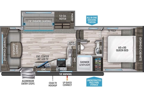 This is the perfect fifth wheel to take to the lake or other scenic camp spot! The spacious rear dinette is surrounded by large windows that bring the beautiful scenery inside. The theater sofa is also backed by a large picture window, so wherever you sit is almost like being outside! The L-shape kitchen has lots of counter space and an additional flip-up counter extension, and you'll love the double refrigerator. There is a 40" TV that can be viewed from anywhere in the kitchen and living area. The bedroom features a roomy closet and drawers, and the bathroom offers a spacious walk-in shower and large vanity.