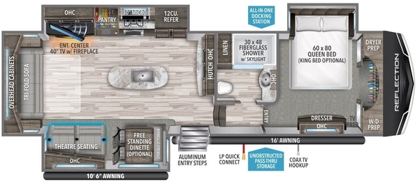 Air Conditioning +Air Conditioning (BTUs)15000Air Conditioning TypeAutomaticAwning +Awning Length (ft)26.5Number of Awnings2Power Retractable AwningBathroom +Bathroom Flooring TypeVinylBathroom LocationCenterNumber Of Bathrooms1Bathroom Medicine Cabinet +Bathroom Medicine Cabinet LocationCenterBathroom Mirror +Bathroom Mirror LocationCenterBathroom Sink +Bathroom Sink LocationCenterBathroom Vent / Fan System +Bathroom Vent / Fan System LocationCenterBattery +Battery Power ConverterBeds +Max Sleeping Count6Number Of Convertible / Sofa Beds2Number Of Queen Size Beds1Brakes +Front Brake TypeNot ApplicableRear Brake TypeElectric DrumCD Player +Number Of Discs1Construction +Body MaterialAluminumSidewall ConstructionFiberglassDimensions +Height (in)150Length (ft)35'6"Doors +Number of Doors1Emergency Exit(s) +Number Of Emergency Exits1Heater +Heater (BTUs)35000Heater TypeAutomaticHolding Tanks +Number Of Black Water Holding Tanks1Number Of Fresh Water Holding Tanks1Number Of Gray Water Holding Tanks1Total Black Water Tank Capacity (gal)47Total Fresh Water Tank Capacity (gal)74Total Gray Water Tank Capacity (gal)87Interior Decor +Interior Wood FinishWallpaperKitchen / Living Area +Kitchen / Living Area Flooring TypeCarpet / VinylKitchen LocationCenterKitchen Table ConfigurationBench SeatsLiving Area LocationRearLeveling Jacks +Leveling Jack TypeFront Power / Rear PowerMaster Bedroom +Full Size Master Bedroom ClosetMaster Bedroom Door StyleConventional DoorMaster Bedroom Flooring TypeCarpetMaster Bedroom LocationFrontMaster Bedroom Mirror DoorsMaster Bedroom Shades / CurtainsOven / Stove +LayoutOven / StoveNumber Of Oven Burners3Overhead FanPrewiring +Air Conditioning PrewiringBack-Up CameraCable PrewiringHeat PrewiringSatellite PrewiringSolarTV Antenna PrewiringWasher / Dryer PrewiringPropane Tank(s) +Number Of Propane Tanks2Total Propane Tank Capacity (gal)14.2Radio +Number Of Radios1Rear Hitch +Rear Hitch TypeReceiverSize (in)2Recliners / Rockers +MaterialVinylNumber Of Recliner / Rockers2Refrigerator +Refrigerator Power ModeElectric / PropaneRefrigerator SizeFull-SizeShower +Door TypePlastic / GlassShower LocationCenterSlideouts +Number of Slideouts3Power Retractable SlideoutSofa +Number Of Sofas1Sofa MaterialVinylSpare Tire +Spare Tire LocationExterior MountedSpeakers +Speaker Location(s)Interior / ExteriorSurround SoundTelevision +Number Of Televisions1Tires +Rear Tire (Full Spec)E Rated Nitrogen Filled Radial Goodyear TiresRear Tire Speed RatingETire BrandGoodyear®Toilet +Toilet LocationCenterToilet TypePorcelainWater Heater Tank +Water Heater Pump Power ModeElectrical / PropaneWater Heater Tank BypassWater Heater Tank Capacity (g)6Weight +Dry Weight (lbs)10697GVWR (lbs)13995Hitch Weight (lbs)2090Payload Capacity (lbs)3298Wheels +Number Of Axles2Wheels CompositionAluminumWireless / Connectivity +Bluetooth® Audio