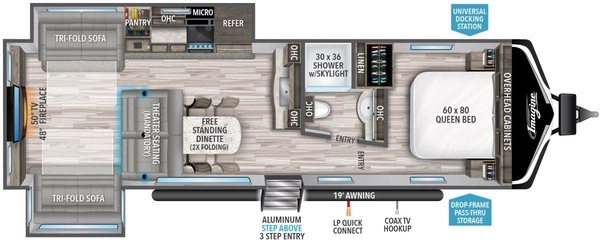 Air Conditioning +Air Conditioning (BTUs)15000Air Conditioning TypeAutomaticAwning +Awning Length (ft)19Number of Awnings1Power Retractable AwningBathroom +Bathroom Flooring TypeVinylBathroom LocationCenterNumber Of Bathrooms1Bathroom Medicine Cabinet +Bathroom Medicine Cabinet LocationCenterBathroom Mirror +Bathroom Mirror LocationCenterBathroom Sink +Bathroom Sink LocationCenterBathroom Vent / Fan System +Bathroom Vent / Fan System LocationCenterBattery +Battery Power ConverterBeds +Max Sleeping Count6Number Of Convertible / Sofa Beds2Number Of Queen Size Beds1Brakes +Front Brake TypeNot ApplicableRear Brake TypeElectric DrumCD Player +Number Of Discs1Construction +Body MaterialAluminumSidewall ConstructionFiberglassDimensions +Height (in)134Interior Height (in)81Length (ft)35'11"Doors +Number of Doors1Emergency Exit(s) +Number Of Emergency Exits1Heater +Heater (BTUs)35000Heater TypeAutomaticHolding Tanks +Number Of Black Water Holding Tanks1Number Of Fresh Water Holding Tanks1Number Of Gray Water Holding Tanks1Total Black Water Tank Capacity (gal)45Total Fresh Water Tank Capacity (gal)52Total Gray Water Tank Capacity (gal)90Interior Decor +Interior Wood FinishWallpaperKitchen / Living Area +Kitchen / Living Area Flooring TypeCarpet / VinylKitchen LocationCenterKitchen Table ConfigurationChairsLiving Area LocationRearLeveling Jacks +Leveling Jack TypeFront Manual / Rear ManualMaster Bedroom +Master Bedroom Door StyleFull Sliding DoorMaster Bedroom Flooring TypeVinylMaster Bedroom LocationFrontMaster Bedroom Shades / CurtainsOven / Stove +LayoutOven / StoveNumber Of Oven Burners3Overhead FanPrewiring +Air Conditioning PrewiringCable PrewiringHeat PrewiringTV Antenna PrewiringPropane Tank(s) +Number Of Propane Tanks2Total Propane Tank Capacity (gal)9.4Radio +Number Of Radios1Recliners / Rockers +MaterialVinylNumber Of Recliner / Rockers2Refrigerator +Refrigerator Power ModeElectric / PropaneRefrigerator SizeMid-SizeShower +Door TypePlastic / GlassShower LocationCenterSlideouts +Number of Slideouts2Power Retractable SlideoutSofa +Number Of Sofas2Sofa MaterialVinylSpare Tire +Spare Tire LocationExterior MountedSpeakers +Speaker Location(s)Interior / ExteriorTelevision +Number Of Televisions1Tires +Rear Tire (Full Spec)Nitrogen Filled Radial TiresToilet +Toilet LocationCenterToilet TypePorcelainWater Heater Tank +Water Heater Pump Power ModeElectrical / PropaneWater Heater Tank BypassWater Heater Tank Capacity (g)6Weight +Dry Weight (lbs)7778GVWR (lbs)9495Hitch Weight (lbs)791Payload Capacity (lbs)1717Wheels +Number Of Axles2Wheels CompositionAluminumWireless / Connectivity +Bluetooth® Audio
