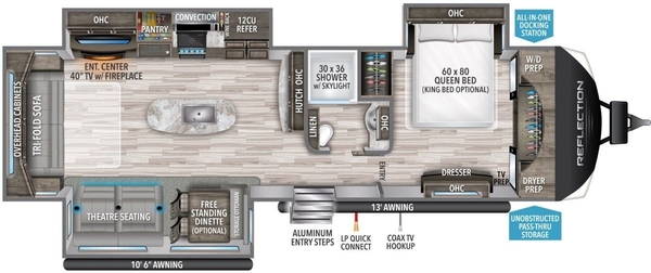 Air Conditioning +Air Conditioning (BTUs)15000Air Conditioning TypeAutomaticAwning +Awning Length (ft)23.5Number of Awnings2Power Retractable AwningBathroom +Bathroom Flooring TypeVinylBathroom LocationCenterNumber Of Bathrooms1Bathroom Medicine Cabinet +Bathroom Medicine Cabinet LocationCenterBathroom Mirror +Bathroom Mirror LocationCenterBathroom Sink +Bathroom Sink LocationCenterBathroom Vent / Fan System +Bathroom Vent / Fan System LocationCenterBattery +Battery Power ConverterBeds +Max Sleeping Count6Number Of Convertible / Sofa Beds2Number Of Queen Size Beds1Brakes +Front Brake TypeNot ApplicableRear Brake TypeElectric DrumCD Player +Number Of Discs1Construction +Body MaterialAluminumSidewall ConstructionFiberglassDimensions +Height (in)140Length (ft)37'11"Doors +Number of Doors1Emergency Exit(s) +Number Of Emergency Exits1Heater +Heater (BTUs)35000Heater TypeAutomaticHolding Tanks +Number Of Black Water Holding Tanks1Number Of Fresh Water Holding Tanks1Number Of Gray Water Holding Tanks2Total Black Water Tank Capacity (gal)43Total Fresh Water Tank Capacity (gal)54Total Gray Water Tank Capacity (gal)118Interior Decor +Interior Wood FinishWallpaperKitchen / Living Area +Kitchen / Living Area Flooring TypeCarpet / VinylKitchen LocationCenterKitchen Table ConfigurationBench SeatsLiving Area LocationRearLeveling Jacks +Leveling Jack TypeFront Power / Rear PowerMaster Bedroom +Full Size Master Bedroom ClosetMaster Bedroom Door StyleFull Sliding DoorMaster Bedroom Flooring TypeVinylMaster Bedroom LocationFrontMaster Bedroom Mirror DoorsMaster Bedroom Shades / CurtainsOven / Stove +LayoutOven / StoveNumber Of Oven Burners3Overhead FanPrewiring +Air Conditioning PrewiringCable PrewiringHeat PrewiringSatellite PrewiringSolarTV Antenna PrewiringWasher / Dryer PrewiringPropane Tank(s) +Number Of Propane Tanks2Total Propane Tank Capacity (gal)14.2Radio +Number Of Radios1Rear Hitch +Rear Hitch TypeReceiverRecliners / Rockers +MaterialVinylNumber Of Recliner / Rockers2Refrigerator +Refrigerator Power ModeElectricRefrigerator SizeFull-SizeShower +Door TypePlastic / GlassShower LocationCenterSlideouts +Number of Slideouts3Power Retractable SlideoutSofa +Number Of Sofas1Sofa MaterialVinylSpare Tire +Spare Tire LocationExterior MountedSpeakers +Speaker Location(s)Interior / ExteriorSurround SoundTelevision +Number Of Televisions1Tires +Rear Tire (Full Spec)E Rated Goodyear TiresRear Tire Speed RatingETire BrandGoodyear®Toilet +Toilet LocationCenterToilet TypePorcelainWater Heater Tank +Water Heater Pump Power ModeElectrical / PropaneWater Heater Tank BypassWater Heater Tank Capacity (g)6Weight +Dry Weight (lbs)9297GVWR (lbs)11295Hitch Weight (lbs)1065Payload Capacity (lbs)1998Wheels +Number Of Axles2Wheels CompositionAluminumWireless / Connectivity +Bluetooth® Audio