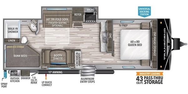 Air Conditioning +Air Conditioning (BTUs)13500Air Conditioning TypeAutomaticAwning +Awning Length (ft)17Number of Awnings1Power Retractable AwningBathroom +Bathroom Flooring TypeVinylBathroom LocationRearNumber Of Bathrooms1Bathroom Medicine Cabinet +Bathroom Medicine Cabinet LocationRearBathroom Mirror +Bathroom Mirror LocationRearBathroom Sink +Bathroom Sink LocationRearBathroom Vent / Fan System +Bathroom Vent / Fan System LocationRearBattery +Battery Power ConverterBeds +Max Sleeping Count10Number Of Convertible / Sofa Beds2Number Of Double Beds2Number Of Queen Size Beds1Brakes +Front Brake TypeNot ApplicableRear Brake TypeElectric DrumCapacities +Storage Capacity (gal)276.4Construction +Body MaterialWoodSidewall ConstructionAluminumDimensions +Height (in)132Interior Height (in)78Length (ft)30'11"Doors +Number of Doors1Emergency Exit(s) +Number Of Emergency Exits1Exterior Kitchen +RefrigeratorStoveHeater +Heater (BTUs)30000Heater TypeAutomaticHolding Tanks +Number Of Black Water Holding Tanks1Number Of Fresh Water Holding Tanks1Number Of Gray Water Holding Tanks1Total Black Water Tank Capacity (gal)39Total Fresh Water Tank Capacity (gal)62Total Gray Water Tank Capacity (gal)78Interior Decor +Interior Wood FinishWallpaperKitchen / Living Area +Kitchen / Living Area Flooring TypeCarpet / VinylKitchen LocationCenterKitchen Table ConfigurationBench SeatsLiving Area LocationCenterLeveling Jacks +Leveling Jack TypeFront Manual / Rear ManualMaster Bedroom +BunkhouseMaster Bedroom Door StyleFull Sliding DoorMaster Bedroom Flooring TypeVinylMaster Bedroom LocationFrontMaster Bedroom Mirror DoorsMaster Bedroom Shades / CurtainsOven / Stove +LayoutOven / StoveNumber Of Oven Burners3Overhead FanPrewiring +Air Conditioning PrewiringBack-Up CameraCable PrewiringHeat PrewiringSatellite PrewiringSolarTV Antenna PrewiringPropane Tank(s) +Number Of Propane Tanks2Total Propane Tank Capacity (gal)9.4Radio +Number Of Radios1SatelliteRefrigerator +Refrigerator Power ModeElectricRefrigerator SizeMid-SizeShower +Door TypePlastic / GlassShower LocationRearSlideouts +Number of Slideouts1Power Retractable SlideoutSofa +Number Of Sofas1Sofa MaterialVinylSpare Tire +Spare Tire LocationExterior MountedSpeakers +Speaker Location(s)Interior / ExteriorTelevision +Number Of Televisions1Tires +Rear Tire (Full Spec)Nitrogen Filled Radial TiresToilet +Toilet LocationRearToilet TypePlasticWater Heater Tank +Water Heater Pump Power ModeElectrical / PropaneWater Heater Tank BypassWater Heater Tank Capacity (g)6Weight +Dry Weight (lbs)6078GVWR (lbs)7695Hitch Weight (lbs)618Payload Capacity (lbs)1617Wheels +Number Of Axles2Wheels CompositionAluminumWireless / Connectivity +Bluetooth® Audio
