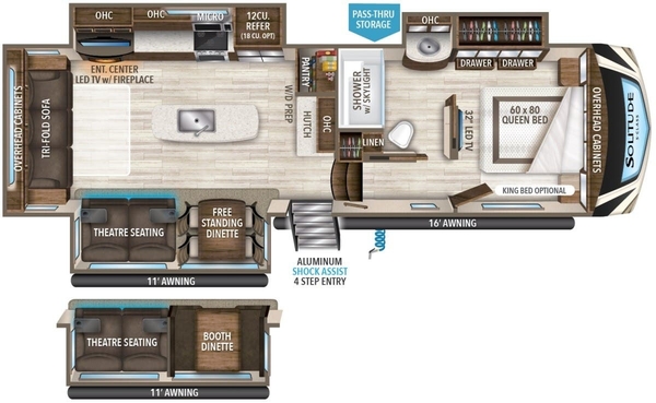 Air Conditioning +Air Conditioning (BTUs)28500Air Conditioning TypeAutomaticAwning +Awning Length (ft)27Number of Awnings2Power Retractable AwningBathroom +Bathroom Flooring TypeVinylBathroom LocationCenterNumber Of Bathrooms1Bathroom Medicine Cabinet +Bathroom Medicine Cabinet LocationCenterBathroom Mirror +Bathroom Mirror LocationCenterBathroom Sink +Bathroom Sink LocationCenterBathroom Vent / Fan System +Bathroom Vent / Fan System LocationCenterBattery +Battery Converter Amps55Battery Power ConverterBeds +Max Sleeping Count6Number Of Convertible / Sofa Beds1Number Of Queen Size Beds1Brakes +Front Brake TypeNot ApplicableRear Brake TypeElectric DrumConstruction +Body MaterialAluminumSidewall ConstructionFiberglassDimensions +Height (in)161Length (ft)34'3"Width (in)101Doors +Number of Doors1Heater +Heater (BTUs)35000Heater TypeAutomaticHolding Tanks +Number Of Black Water Holding Tanks1Number Of Fresh Water Holding Tanks1Number Of Gray Water Holding Tanks1Total Black Water Tank Capacity (gal)53Total Fresh Water Tank Capacity (gal)91Total Gray Water Tank Capacity (gal)100Interior Decor +Interior Wood FinishWallpaperKitchen / Living Area +Kitchen / Living Area Flooring TypeVinylKitchen LocationCenterKitchen Table ConfigurationChairsLiving Area LocationRearLeveling Jacks +Leveling Jack TypeFront Power / Rear PowerMaster Bedroom +Full Size Master Bedroom ClosetMaster Bedroom Door StyleConventional DoorMaster Bedroom Flooring TypeVinylMaster Bedroom LocationFrontMaster Bedroom Mirror DoorsMaster Bedroom Shades / CurtainsMicrowave Oven +ConvectionOven / Stove +LayoutOven / StoveNumber Of Oven Burners3Overhead FanPrewiring +Air Conditioning PrewiringBack-Up CameraCable PrewiringHeat PrewiringSatellite PrewiringSolarTV Antenna PrewiringWasher / Dryer PrewiringPropane Tank(s) +Number Of Propane Tanks2Total Propane Tank Capacity (gal)14.2Radio +Brand NameRockfordNumber Of Radios1SatelliteRear Hitch +Rear Hitch TypeReceiverRecliners / Rockers +MaterialVinylNumber Of Recliner / Rockers2Refrigerator +Refrigerator Power ModeElectric / PropaneRefrigerator SizeFull-SizeShower +Door TypePlastic / GlassShower LocationCenterSlideouts +Number of Slideouts3Power Retractable SlideoutSofa +Number Of Sofas1Sofa MaterialVinylSpare Tire +Spare Tire LocationExterior MountedSpeakers +Speaker Location(s)Interior / ExteriorTelevision +Number Of Televisions2Tires +Rear Tire (Full Spec)17.5 Inch H Rated with NitroFillRear Tire Speed RatingHRear Wheel Diameter17.5Toilet +Toilet LocationCenterToilet TypePorcelainWater Heater Tank +Water Heater Pump Power ModeElectrical / PropaneWater Heater Tank BypassWater Heater Tank Capacity (g)10Weight +Dry Weight (lbs)11442GVWR (lbs)15000Hitch Weight (lbs)2174Payload Capacity (lbs)3558Wheels +Number Of Axles2Wheels CompositionAluminumWireless / Connectivity +Bluetooth® AudioMobile App Instrumentation