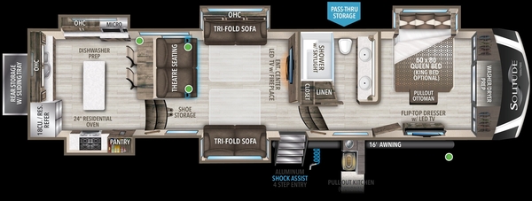Air Conditioning +Air Conditioning (BTUs)30000Air Conditioning TypeAutomaticAwning +Awning Length (ft)16Number of Awnings1Power Retractable AwningBathroom +Bathroom Flooring TypeVinylBathroom LocationCenterNumber Of Bathrooms1Bathroom Medicine Cabinet +Bathroom Medicine Cabinet LocationCenterBathroom Mirror +Bathroom Mirror LocationCenterBathroom Sink +Bathroom Sink LocationCenterBathroom Vent / Fan System +Bathroom Vent / Fan System LocationCenterBattery +Battery Converter Amps55Battery Power ConverterBeds +Max Sleeping Count6Number Of Convertible / Sofa Beds2Number Of Queen Size Beds1Brakes +Front Brake TypeNot ApplicableRear Brake TypeElectric DrumConstruction +Body MaterialAluminumSidewall ConstructionFiberglassDimensions +Height (in)161Length (ft)41'5"Width (in)101Doors +Number of Doors1Emergency Exit(s) +Number Of Emergency Exits1Heater +Heater (BTUs)35000Heater TypeAutomaticHolding Tanks +Number Of Black Water Holding Tanks1Number Of Fresh Water Holding Tanks1Number Of Gray Water Holding Tanks1Total Black Water Tank Capacity (gal)53Total Fresh Water Tank Capacity (gal)93Total Gray Water Tank Capacity (gal)106Interior Decor +Interior Wood FinishWallpaperKitchen / Living Area +Kitchen / Living Area Flooring TypeVinylKitchen LocationRearKitchen Table ConfigurationCounter / IslandLiving Area LocationCenterLeveling Jacks +Leveling Jack TypeFront Power / Rear PowerMaster Bedroom +Full Size Master Bedroom ClosetMaster Bedroom Door StyleConventional DoorMaster Bedroom Flooring TypeVinylMaster Bedroom LocationFrontMaster Bedroom Mirror DoorsMaster Bedroom Shades / CurtainsMicrowave Oven +ConvectionOven / Stove +LayoutOven / StoveNumber Of Oven Burners4Oven Depth (in)24Overhead FanPrewiring +Air Conditioning PrewiringBack-Up CameraCable PrewiringHeat PrewiringSatellite PrewiringSolarTV Antenna PrewiringWasher / Dryer PrewiringPropane Tank(s) +Number Of Propane Tanks2Total Propane Tank Capacity (gal)14.2Radio +Brand NameRockfordNumber Of Radios1SatelliteRear Hitch +Rear Hitch TypeReceiverRecliners / Rockers +MaterialVinylNumber Of Recliner / Rockers2Refrigerator +Refrigerator Power ModeElectric / PropaneRefrigerator SizeFull-SizeShower +Door TypePlastic / GlassShower LocationCenterSlideouts +Number of Slideouts5Power Retractable SlideoutSofa +Number Of Sofas2Sofa MaterialVinylSpare Tire +Spare Tire LocationExterior MountedSpeakers +Speaker Location(s)Interior / ExteriorTelevision +Number Of Televisions2Tires +Rear Tire (Full Spec)17.5 Inch H Rated with NitroFillRear Tire Speed RatingHRear Wheel Diameter17.5Toilet +Toilet LocationCenterToilet TypePorcelainWater Heater Tank +Water Heater Pump Power ModeElectrical / PropaneWater Heater Tank BypassWater Heater Tank Capacity (g)12Weight +Dry Weight (lbs)14562GVWR (lbs)16800Hitch Weight (lbs)2794Payload Capacity (lbs)3464Wheels +Number Of Axles2Wheels CompositionAluminumWireless / Connectivity +Bluetooth® AudioMobile App Instrumentation
