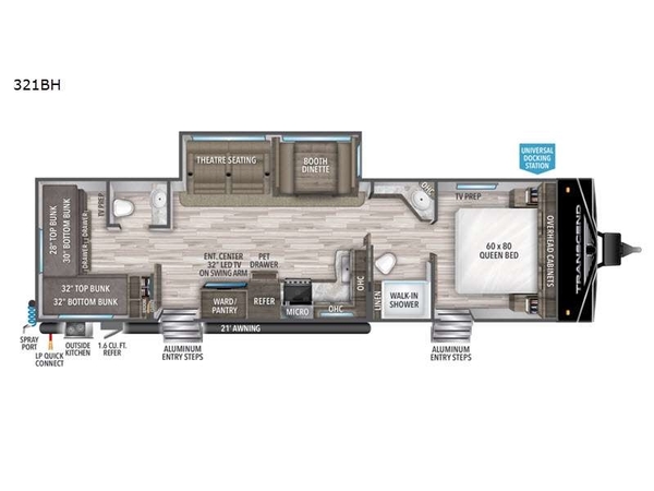 Head to the lake for unforgettable camping trips in this dual-entry travel trailer. The private bunkhouse suite includes four bunks, two drawers to store belongings, plus a half bath for convenience. Everyone will love to gather in the main living area that includes theatre seating, a booth dinette, plus a 32" LED HDTV on a swing arm for a perfect view. You'll find plenty of storage space, including a wardrobe/pantry, a broom closet, plus plenty of overhead compartments for your valuables. This model also includes a full indoor kitchen, as well as an outdoor kitchen with a two-burner cooktop, an exterior spray port, plus a 1.6-cu. ft. refrigerator for cold drinks.