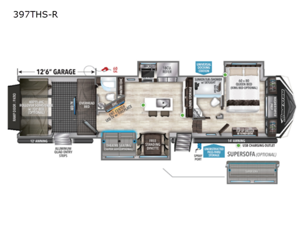 Load up your toys, your clothes and food and start your adventure as you smoothing tow this fifth wheel to your campsite. You will enjoy the Fast Ramp rear ramp door, the Ram-Air garage vents on both sides, the 2,500 lb. rated flush-mount tie-downs and the protective diamond plate on the garage sidewalls. You will surely appreciate the full bathroom and LED TV, plus the option to add Happi-Jac rollover sofas/table with top bed. The main area provides a living and kitchen area with a 49" LED TV and fireplace, theatre seating and a free standing table, plus full kitchen amenities including a residential refrigerator. The kitchen island even offers bar stools. Head up front to use the full bathroom with dual entry, the sunken tub/shower with flip-up teak seat, and fall quickly to sleep on your own queen bed or choose a king option in the front bedroom. There is more to love and options to choose from. And if you would prefer to have an 18-cubic foot RV refrigerator, you should check out model 397THS!