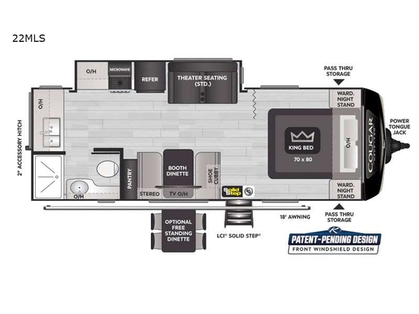 With a king-size bed, this Cougar Half-Ton travel trailer shows that you can still be comfortable even while you're away from home! The bed has wardrobes and nightstands on either side, and it also has a privacy curtain to section it off from the rest of the trailer. When you use the LCI Solid Step entry to get inside, you'll notice and appreciate the shoe cubby to your left. Right next to the booth dinette is the pantry, and next to the pantry is the full bathroom which is certainly one of the most valuable features to any trailer.