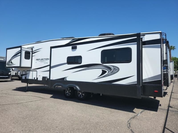 With any Reflection fifth wheels by Grand Design, you will have a 165W solar panel for off-grid camping and a 50 Amp charge controller and inverter prep, a Max Turn radius front cap for easy towing around town and into your campsite, a Universal All-In-One Docking Station, unobstructed pass-through storage, and Goodyear E-rated tires. Some other top features include a chef's kitchen with a 30" stainless steel microwave and residential cooktop, a USB charging station, and the ductless "Evenflow" heating system with no vents in the floor to collect debris. Each is constructed of high gloss gel coat exterior sidewalls, residential 5" truss rafters, walk-on roof decking, a fiberglass and radiant foil roof and front cap insulation plus laminated aluminum framed side walls, rear wall, roof and end walls in slide rooms. Choose luxury, value and towability over all the others, take home a Reflection of your good taste!