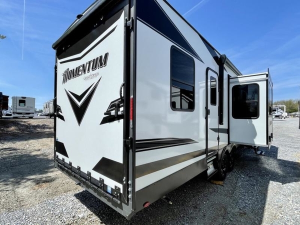 Are you looking for adventure and fun? The Momentum G-Class toy hauler by Grand Design will help you find it! You can explore during any season you choose with the Insulation Package that includes a heated and enclosed underbelly with suspended tanks, a high-capacity furnace, a moisture barrier floor enclosure, and cabinet-mounted heat ducts. Each model includes a 30-gallon fuel station with an interior and exterior gauge, a dovetail rear rend, and 2,500-LB tie-downs anchored into the chassis. Throughout the Momentum G-Class interior, you'll enjoy many comfortable features like large panoramic windows, a shower skylight, USB chargers in the bedroom, and residential cabinetry.