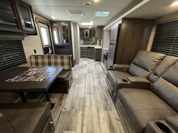 Relaxing weekends to the lake just got sweeter in this spacious travel trailer. Prepare lunch on the three-burner cooktop, and you can enjoy it at the booth dinette. There is also a 60" tri-fold sofa, or you can choose the optional theater seating in place of the sofa if you don't need the extra sleeping space. This model includes plenty of storage space, including a pantry/wardrobe just as you enter the unit, overhead compartments, plus an industry-leading pass-through storage for fishing poles, hiking gear, or lawn chairs! The customer-focused, quality-built Transcend Xplor travel trailers by Grand Design are your ticket to fun and adventure. Each model has been built to last through the seasons thanks to the Quadseal insulation, the double-insulated roof, and the heated and enclosed underbelly with suspended tanks. You will appreciate the power tongue jack when it comes time to set up, as well as the all-in-one utility center and the detachable power cord with an LED light. These models include many outlets throughout, USB ports to charge your gadgets, and an AM/FM/Bluetooth stereo with exterior speakers to keep you entertained. The interior of the Transcend Xplor will have you feeling right at home with upgraded residential furniture, a large, solid bedroom door, and residential countertops, and the list goes on!