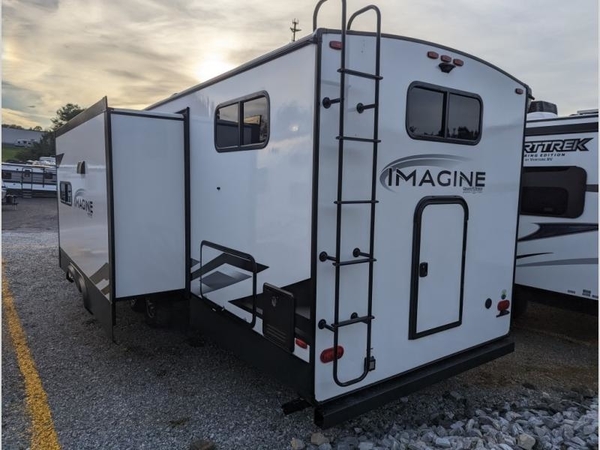 A great travel trailer for larger families or those that enjoy traveling with a few friends! This Imagine quad bunk model features two private bedrooms, the master up front with private entry/exit door just beyond a spacious walk-through bathroom that features a 30" x 36" shower with skylight to bring in more natural lighting each day, plus a toilet, sink and linen storage. In the kitchen, a nice island for food prep and cleaning up makes it easy to be part of the conversation in the room while you get meals ready for everyone. Speaking of food prep, how about the outside griddle and 1.6 cu. ft. refrigerator which is perfect for cooking outside or for making late night snacks when all are enjoying the evening under the stars or in lawn chairs under one of two 9' 6" awnings with LED lighting. Your kids can bring along extra guests with the added sleeping that a quad bunk model provides. And, there is plenty of storage in the private bunkroom with drawers beneath for their things, plus a rear baggage door that is 42" x 22" for even more storage space for extra toys and gear.