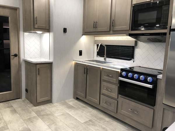 Start your engines for a fun weekend with your toys and your family in this Momentum G-Class toy hauler. The 11' separate garage includes Happi-Jac rollover sofas with a table, a top bunk for the kids, plus a half bath! There is even a second entry door which leads directly into the garage so that you don't have to walk through the entire trailer just to get to your cargo. Now that's helpful! In the front of this unit, you will have your own master suite that has private access to the residential walk-in shower in the dual-entry bathroom. The main living and kitchen area offers everything you need and would want, plus more. This is the one! Are you looking for adventure and fun? The Momentum G-Class toy hauler by Grand Design will help you find it! You can explore during any season you choose with the Insulation Package that includes a heated and enclosed underbelly with suspended tanks, a high-capacity furnace, a moisture barrier floor enclosure, and cabinet-mounted heat ducts. Each model includes a 30-gallon fuel station with an interior and exterior gauge, a dovetail rear rend, and 2,500-LB tie-downs anchored into the chassis. Throughout the Momentum G-Class interior, you'll enjoy many comfortable features like large panoramic windows, a shower skylight, USB chargers in the bedroom, and residential cabinetry.