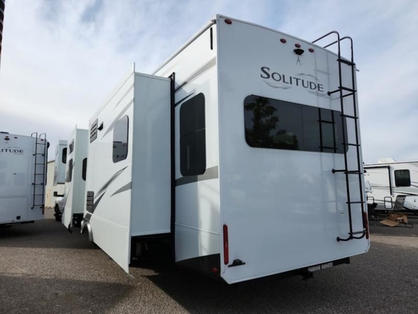 With any Solitude fifth wheel by Grand Design, you will get maximum insulation from the thermal roof design, the exclusive fully laminated walls, the triple insulated main floor, the Rail-Tite underbelly seal, the insulated gooseneck and the insulated baggage doors. The MORryde rubber pin box system utilizes a unique rubber shear spring to positively deal with rough towing and road shock, the Tire Linc TPMS system monitors pressure and temperature, and the 6-point hydraulic system allows you to setup easily. And the upgraded shower system, the hardwood window valances, the oversized kitchen pantry, the window above the master bed headboard, and the Rockford Fosgate stereo entertainment system with HDMI and App controls are a few more reasons you will love these extended-stay fifth wheels!
