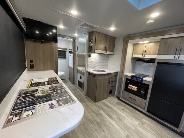 You will feel right at home in this travel trailer! Everyone will have a comfortable place to sleep between the front queen Murphy bed which can transform into a sofa and the 32" x 72" bunk beds. After you have prepared a delicious meal on the two burner cooktop or outside griddle, you can enjoy it at the bar tabletop dinette with four stools for seating. The full bathroom has a walk-in shower with skylight to let in natural lighting and a flip-up sink to save on space!