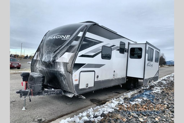 With this Imagine travel trailer, you won't have to imagine what a great camping trip will be like because you can live it! The kitchen includes everything you will need to prepare a meal for everyone, like a 10-cubic foot refrigerator, three-burner range with oven, microwave, stainless steel sink, and flip-up countertop extension. There is a pet dish below the refrigerator, and the LED HDTV sits across from the tri-fold sofa and U-shaped dinette with removable ottoman so that you can watch a movie or the big game in comfort. Another great addition is the private bunkhouse because it provides you with a second secluded sleeping space. This bunkhouse includes a wardrobe, drawers, and an area prepped for a TV.