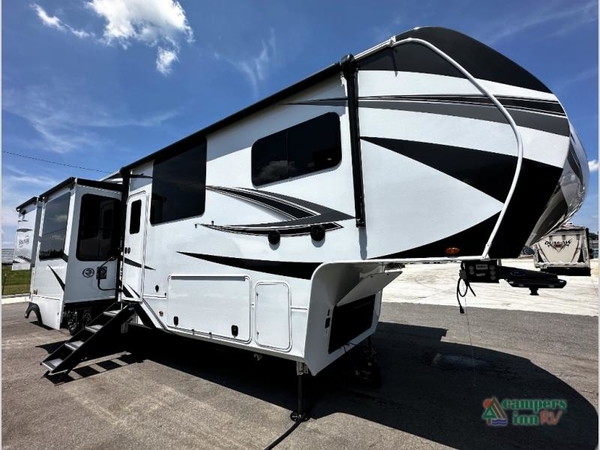 Enjoy each and every vacation, month-long trip or even extended stay at an RV park in this spacious fifth wheel! The rear kitchen gives the cook plenty of room to whip up any type of meal using the stainless steel appliances including the 24" residential oven, the oversized pantry and the raised bar top will provide you even more counter space on top of dining with two chairs that overlook the middle living area. Relaxing is made easy with the two tri-fold sofas and theatre seating while watching the big game on the LED Smart TV and enjoying the fireplace below. Dual sinks in the full bathroom allow two people to easily get ready at once, and the seat in the shower is a nice convenience. At night, retire to your own queen bed slide and enjoy a show on the LED TV above the flip-top dresser.