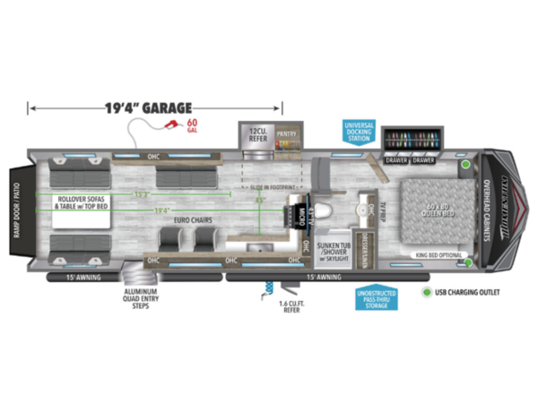 The main living area offers a pair of reclining euro chairs, rollover sofa and kitchen appliances away from the dirty garage floor. You will also be able to stay clean and ready for the next ride with the sunken tub/shower in the full bathroom, and the front master bedroom has plenty of storage for clothing with the wardrobe slide and overhead cabinets. You might even choose to add a washer and dryer to this trailer to keep everything clean while away from home.
