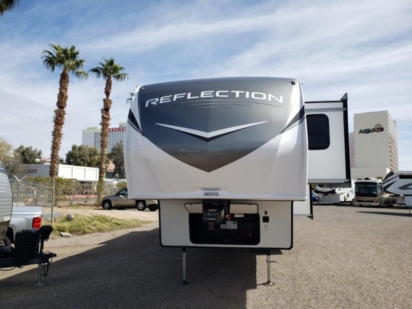 With any Reflection fifth wheels by Grand Design, you will have a 165W solar panel for off-grid camping and a 50 Amp charge controller and inverter prep, a Max Turn radius front cap for easy towing around town and into your campsite, a Universal All-In-One Docking Station, unobstructed pass-through storage, and Goodyear E-rated tires. Some other top features include a chef's kitchen with a 30" stainless steel microwave and residential cooktop, a USB charging station, and the ductless "Evenflow" heating system with no vents in the floor to collect debris. Each is constructed of high gloss gel coat exterior sidewalls, residential 5" truss rafters, walk-on roof decking, a fiberglass and radiant foil roof and front cap insulation plus laminated aluminum framed side walls, rear wall, roof and end walls in slide rooms. Choose luxury, value and towability over all the others, take home a Reflection of your good taste!