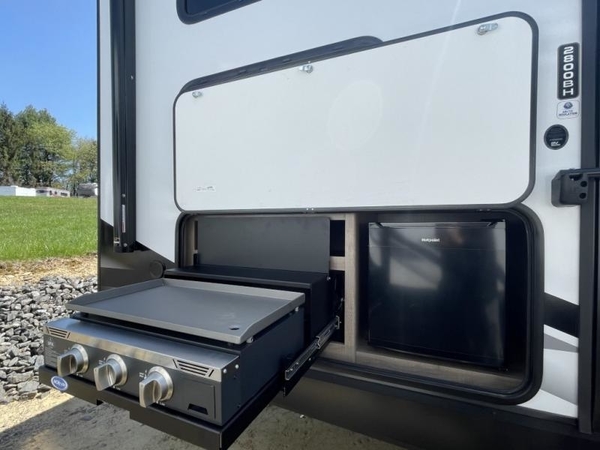 Where will you go with this Imagine travel trailer? The possibilities are endless! You can take your family on an exciting excursion because this trailer has enough sleeping space for everyone with a 60" x 80" queen bed in the private bedroom, a U-shaped dinette and tri-fold sofa in the main living area, and there is a set of 47" x 76" bunk beds with privacy curtains in the rear corner. You can come and go as you please with two entry doors, and the outdoor griddle and refrigerator will be fun to use when the weather is nice. Your family's pet can eat out of the pet dish below the refrigerator, and the large slide will keep this trailer feeling spacious.