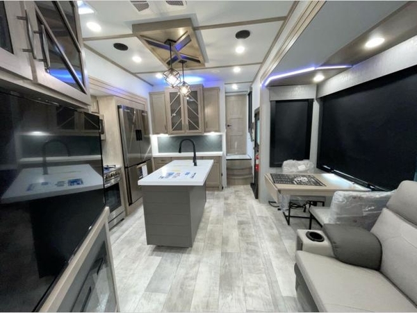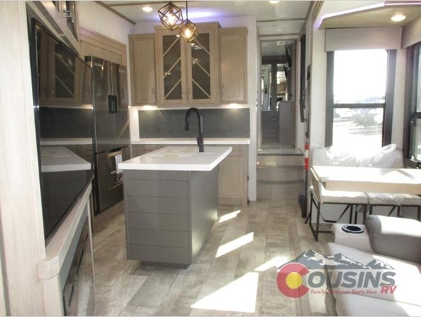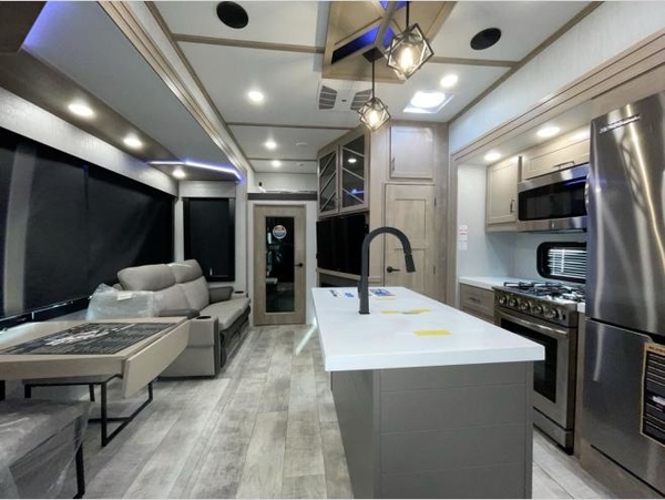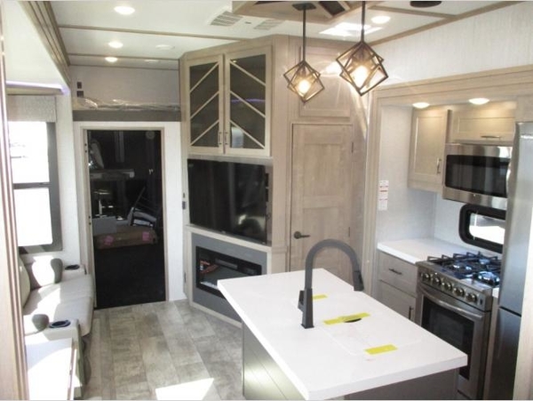 Load up your toys, your clothes and food and start your adventure as you smoothing tow this fifth wheel to your campsite. You will enjoy the Fast Ramp rear ramp door, the Ram-Air garage vents on both sides, the 2,500 lb. rated flush-mount tie-downs and the protective diamond plate on the garage sidewalls. You will surely appreciate the full bathroom and LED TV, plus the option to add Happi-Jac rollover sofas/table with top bed. The main area provides a living and kitchen area with a 49" LED TV and fireplace, theatre seating and a free standing table, plus full kitchen amenities. The kitchen island even offers bar stools. Head up front to use the full bathroom with dual entry, the sunken tub/shower with flip-up teak seat, and fall quickly to sleep on your own queen bed or choose a king option in the front bedroom. There is more to love and options to choose from. And if you would prefer to have a residential refrigerator, you should check out model 397THS-R!