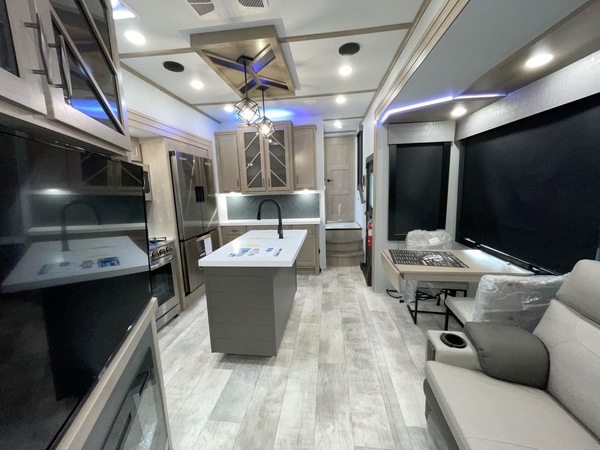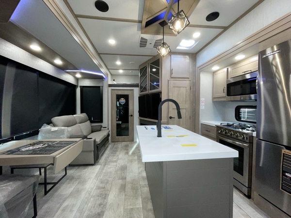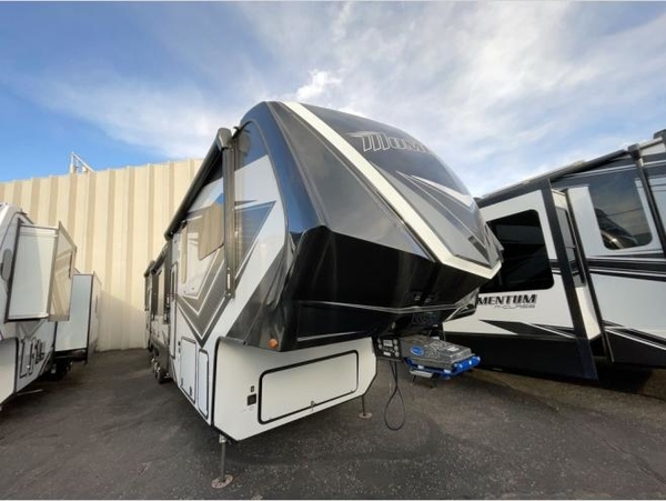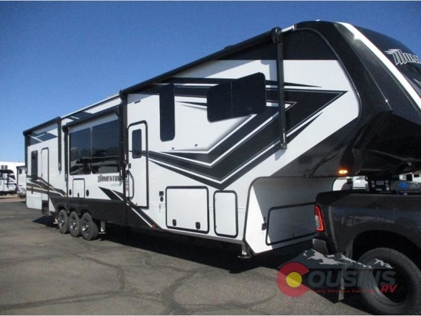 The Momentum fifth wheel toy haulers by Grand Design are built for four seasons of travel with your off-road toys and include luxurious accommodations throughout for extreme living! Each is constructed to a superior standard with the thermal roof design, the full-laminated walls, the triple insulated garage floor in most toy haulers, the insulated gooseneck and the Rail-Tite underbelly seat. The MORryde CRE3000 suspension system and rubber pin box, plus the upgraded axle hangers provide the performance and smooth towing you desire, while the interior offers luxury such as color changing LED accent lighting, raised panel hardwood cabinet doors with hidden hinges, a sofa with headrest and removable swivel tables which include heat, massage and LED lighting package, and a central vacuum system with tools and dust pan. Start your extreme playtime now with a Momentum!