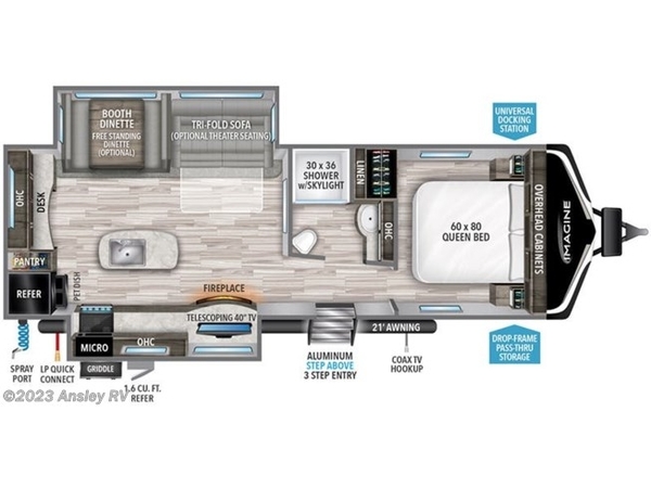 Imagine Ultimate Power Package: Adjustable Power Awning with LED Lights, LED Interior Lighting, Motion Sensor Pass Thru Lighting (LED), AM/FM Bluetooth Stereo, 30 AMP Service, HI Definition LED TV, Detachable Power Cord, Ducted Main A/C, Motion Sensor Lighting (LED), Power Tongue Jack, Exterior Cable Hookup, Compass Connect, Tire Linc TPMS Prep
