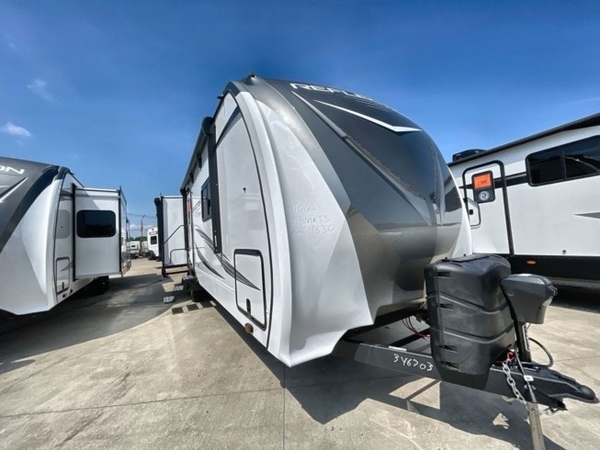 The inside of this travel trailer is just as inviting, if not more so! Upon entering, you will find yourself in the hallway that divides the living and kitchen area to your left from the bedroom and bathroom to your right. The kitchen in the rear corner is the perfect place to prepare your meals! The island kitchen with storage and large stainless steel sink helps make clean-up a breeze! And the inclusion of a 16cu ft refrigerator/freezer, convectional microwave, three-burner range, oven, and pantry make for worry-free meal prep!