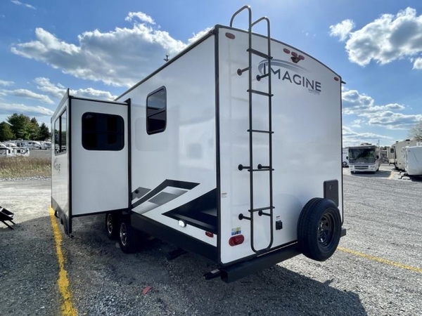 Just imagine what you can do with this Imagine travel trailer! You'll have a U-shaped dinette with removable ottoman so that you can relax in true comfort. The kitchen sits across from the dinette and includes a flip-up countertop extension for more prep space. The private bedroom includes a 60" x 80" queen bed with overhead cabinets and closets on either side of the bed, and the 47" x 76" bunks have privacy curtains that you can close to create a private sleeping area. You'll love having your own bathroom with 30" x 36" shower and skylight so that you don't have to wait in line to use the campsite's facilities, and you can head outside anytime to create a delicious meal at the outdoor griddle with nearby 1.6 cu. ft. refrigerator.