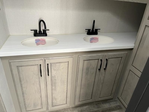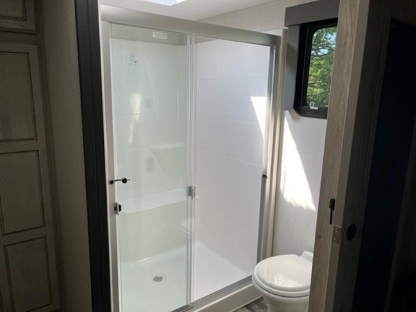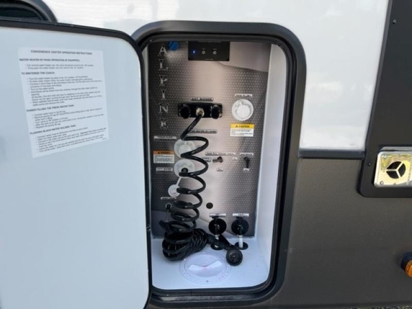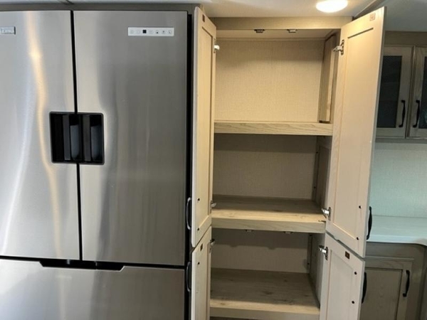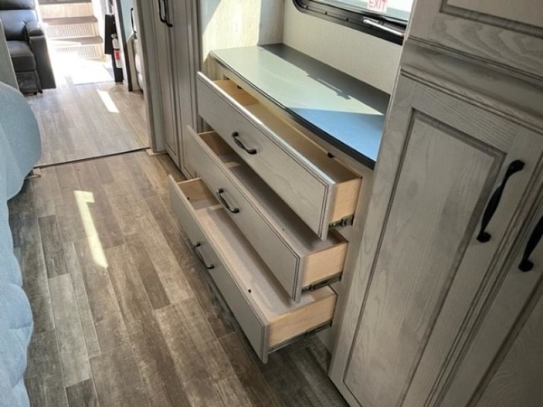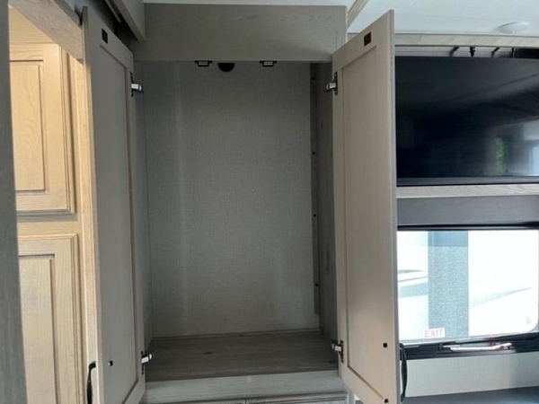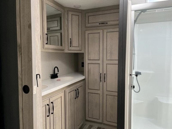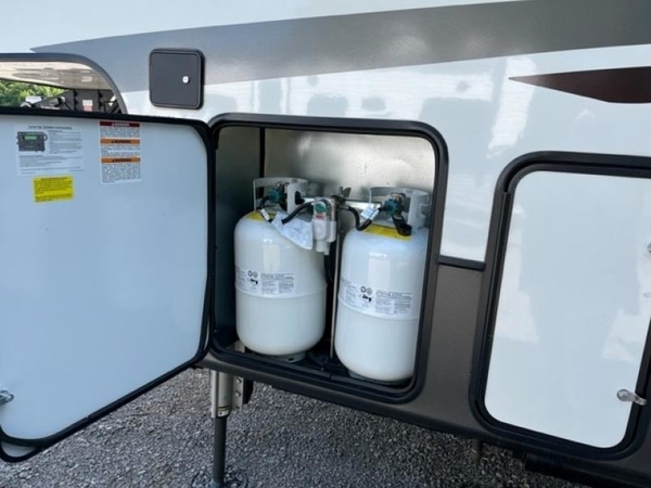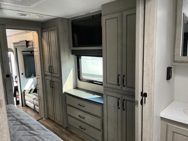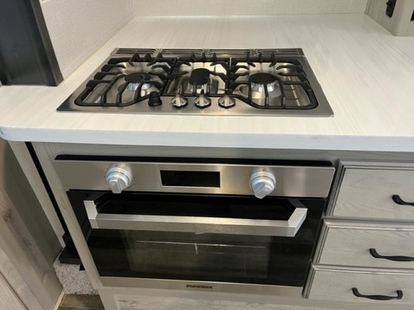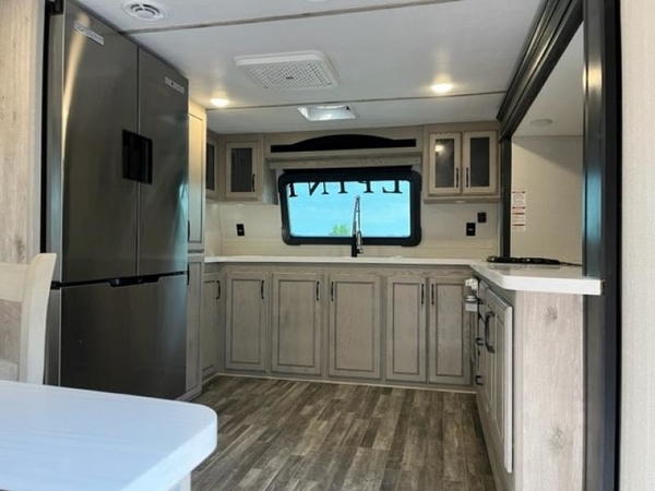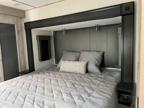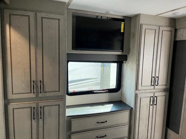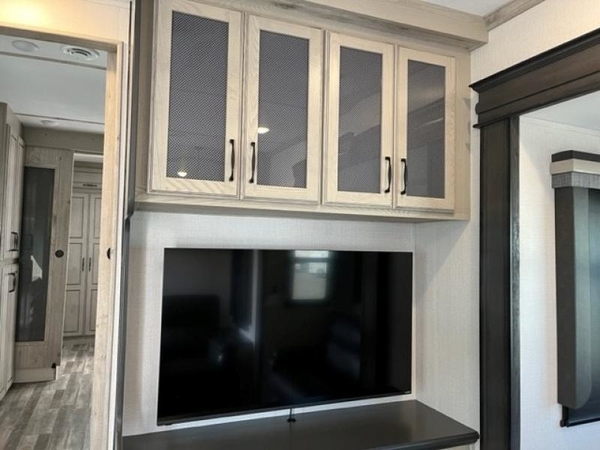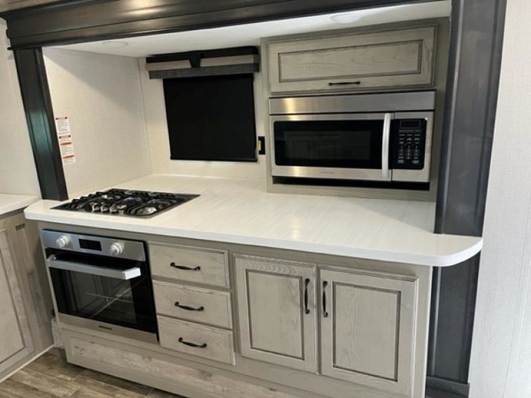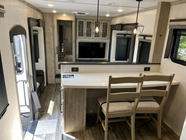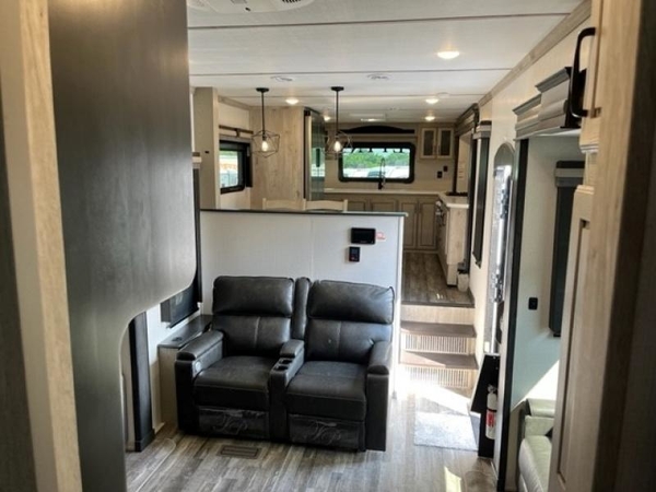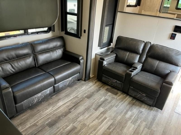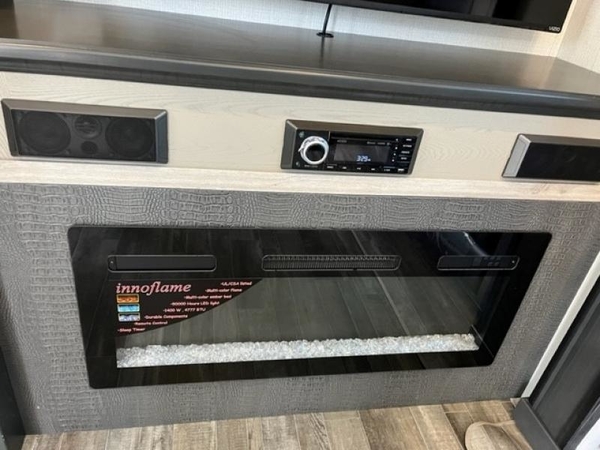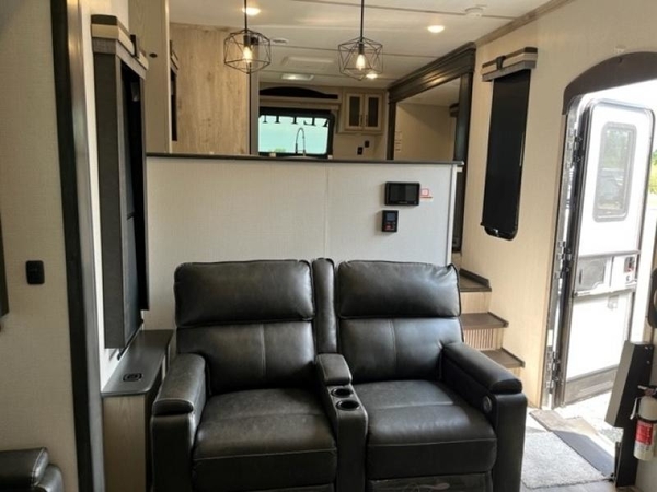 The chef of your group will love cooking in the front kitchen of this fifth wheel! The kitchen not only has extra countertop space to prepare your meals, a convection microwave, and 18 cu. ft. gas/electric refrigerator, but also a bar top with two bar stools overlooking the middle living area. Inside the living area is opposing tri-fold sofa sleeper slides that can be converted for extra sleeping spaces and Thomas Payne theater seating with heat, massage, LED lights, and a USB charging station across from an entertainment center with a 40" fireplace and 50" TV. The master suite has a king bed slide that has storage underneath and a chest with wardrobes on either side, plus access to the full rear bathroom which has a walk-in shower, a dual sink vanity for two to get ready at once, and an area prepped to add an optional washer and dryer!