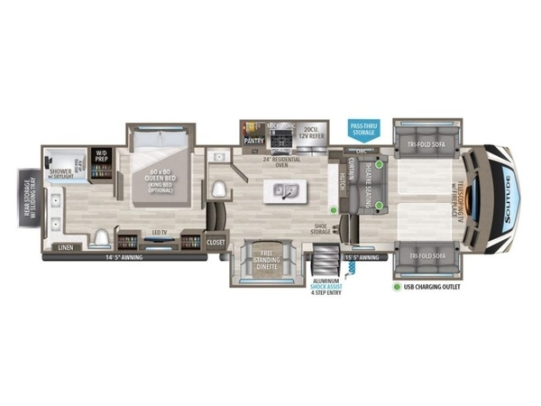 Outdoor Splendor: The exterior of the Solitude 380FL is designed for outdoor splendor, featuring a large electric awning, high-quality outdoor speakers, and ample storage compartments for your camping essentials. Embrace the beauty of nature while reveling in all the comforts of home.