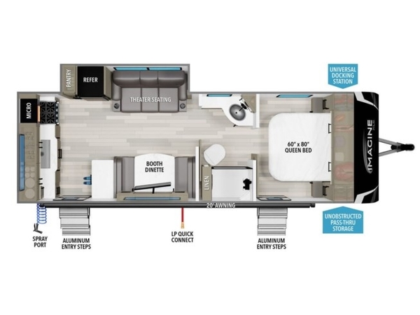 The 2024 Grand Design Imagine XLS 23LDE also excels in providing a delightful outdoor experience, featuring an electric awning with LED lighting for outdoor gatherings and leisure. This model is well-equipped with modern amenities such as a heating and cooling system, a comprehensive bathroom with a spacious shower, and a generous freshwater tank. With features like automatic leveling, a functional floor plan, and excellent storage solutions, the Imagine XLS 23LDE offers a fantastic camping experience for those who seek a balance of space, style, and comfort while exploring the great outdoors.