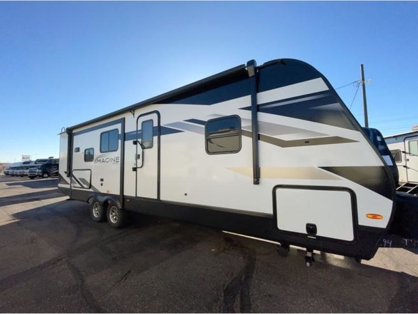 Just imagine leaving the world behind and secluding yourself away with your favorite people in your Grand Design Imagine travel trailer! The Imagine has been designed to enjoy extended season camping and includes a high-capacity furnace, a heated and enclosed underbelly with suspended tanks, a designated heat duct to the subfloor, and a high-density roof insulation with attic vent. You'll have maximum head room on the interior with 81" radius ceilings, and large panoramic windows to let in natural lighting. The exclusive drop-frame pass-through storage compartment is going to allow you to bring along lots of equipment, and the universal docking station is an all-in-one location for utilities and hook-ups. You'll also have industry-leading tank capacities so that you can fill and empty your tanks less often.