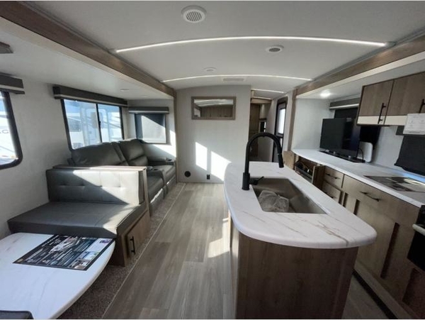 With this Imagine travel trailer, you can work while you're on the road because it offers you a desk in the main living area. You won't have to miss out on the action since you'll be right next to the booth dinette and tri-fold sofa, and there is even a pantry directly to the left of the desk for you to grab a quick snack while you're working. Once you're done with work, you can relax on the tri-fold sofa while you watch the telescoping 40" LED HDTV, and the private bedroom offers you a 60" x 80" queen bed to rest on when you're ready to call it a night.