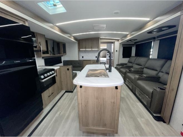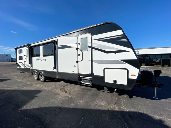 A great travel trailer for larger families or those that enjoy traveling with a few friends! This Imagine quad bunk model features two private bedrooms, with the master up front including a private entry/exit door just beyond a spacious walk-through bathroom that features a 30" x 36" shower with skylight to bring in more natural lighting each day, plus a toilet, sink and linen storage. In the kitchen, a nice island for food prep and cleaning up makes it easy to be part of the conversation in the room while you get meals ready for everyone. Speaking of food prep, how about the outside griddle and 1.6 cu. ft. refrigerator which is perfect for cooking outside, or for making late night snacks when all are enjoying the evening under the stars or in lawn chairs under one of two 9' 6" awnings with LED lighting. Your kids can bring along extra guests with the added sleeping that a quad bunk model provides. And, there is plenty of storage in the private bunkroom with drawers beneath for their things, plus a rear baggage door that is 42" x 22" for even more storage space for extra toys and gear.