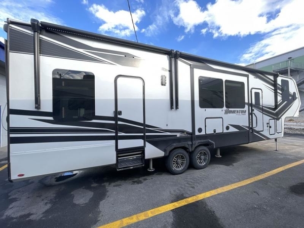 With any Momentum M-Class toy hauler by Grand Design, you will enjoy luxury at every turn! They have been constructed to a superior standard with a thermal roof design, triple insulated main floor and garage floor, and a Rail-Tite underbelly seal that will allow you to camp in all elements. Each model also features an 8' 5" wide body chassis with a wide rail design, no wheel wheels, and a dovetail entry for easier loading. The Stealth A/C system provides maximum cooling power, and the CRE3000 suspension system means you can enjoy a smooth tow each time. You will love the luxurious interior with a professional grade stainless steel cooktop, interior color changing LED accent lighting, a fiberglass shower with a glass door, and solid surface countertops.