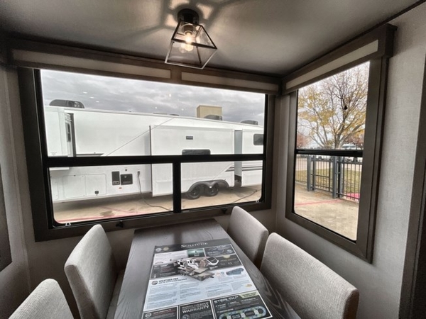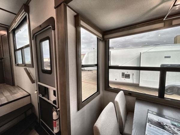 Each minute spent in this spacious fifth wheel will feel just like home! The rear living area includes a rear entertainment center with an LED Smart TV and a fireplace, overhead cabinets, theater seating, plus two tri-fold sofas for your guests to sleep on. You will have the front private bedroom all to yourselves with a queen bed slide out that can be switched out for an optional king bed, and the front closet provides all the space you need to store your belongings. This model includes a spacious full bath with a flip-up teak seat, a shower skylight, plus dual bath sinks for ultimate convenience. The chef of your group will love the middle kitchen with its convenient island including double sinks, a residential cooktop and 24" oven, 20 cu. ft. refrigerator, and free-standing dinette plus a hutch and buffet for storage. Head outdoors to find a 16' power awning with LED lights and middle pass through along with rear storage including a sliding tray, and you might want to add the optional pull-out kitchen.