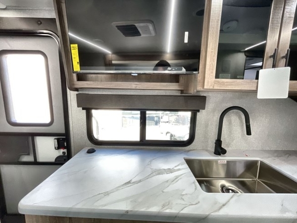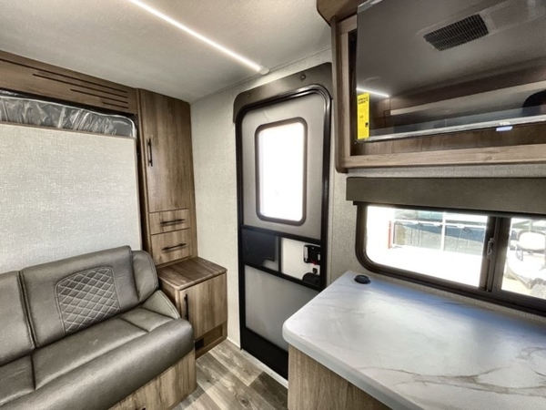 The Murphy bed is the eye-catching feature on this Imagine XLS travel trailer! Not only can it fold away in the morning to reveal a sofa for lounging, but it will also provide you with drawer storage under the sofa. Another functional feature is the theater dinette with a removable table in front. It rests on the single slide so that there is more floor space, and it offers you great comfort while you dine across from the LED HDTV. A full bathroom will keep you clean and fresh with its residential walk-in shower, skylight, linen closet, vanity, toilet, and power vent fan.