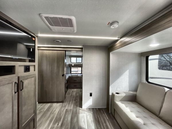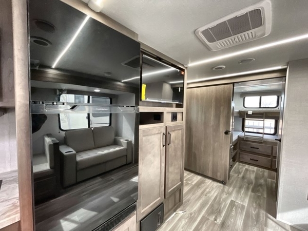 Head to the lake for unforgettable camping trips in this dual-entry travel trailer. The private bunkhouse suite includes four bunks, two drawers to store belongings, plus a half bath for convenience. Everyone will love to gather in the main living area that includes an EZ Glide sofa or optional theatre seating, a booth dinette, plus a 32" LED HDTV on a swing arm for a perfect view. You'll find plenty of storage space, including a wardrobe/pantry, a broom closet, plus plenty of overhead compartments for your valuables. This model also includes a full indoor kitchen, as well as an outdoor kitchen with a two-burner cooktop, an exterior spray port, plus a 1.6-cu. ft. refrigerator for cold drinks.