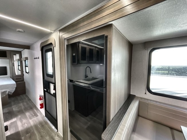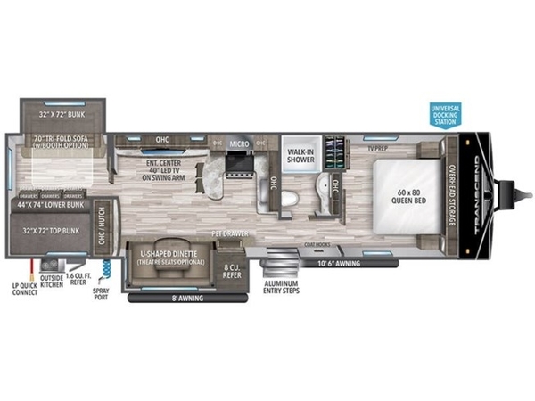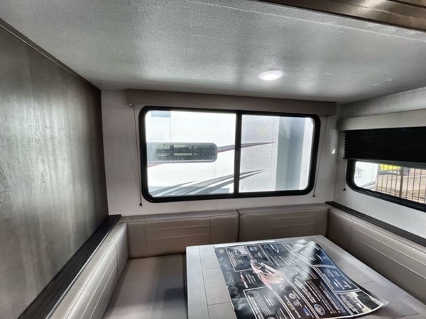This travel trailer can comfortably sleep nine people each night thanks to the added rear private bunkhouse. Here, you'll find three bunks, a tri-fold sofa that can be optioned out for a booth dinette, plus six drawers under the bunks for clothes. You will have the front private bedroom all to yourselves with a queen bed and dual nightstands, and any other guests can sleep on the U-shaped dinette in the main living area. There is also an entertainment center here, a pet drawer under the 8 cu. ft. 12V refrigerator, and a counter with stools to enjoy your coffee at.