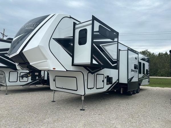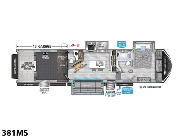 2024 Grand Design Momentum M-Class 381MExtraordinary Living. Extreme Play.The Momentum Fifth Wheel Toy Hauler is the point where absolute luxury meets mobile garage! We have completely raised the Toy Hauler bar by incorporating an elegant Master Bath and Master Suite (with a full walk-in closet) into this unit! But trust us, we didn't ignore the Living and Garage areas. Check out our Floorplan Fly-Through Videos and get a feel for the extraordinary space we've created. We know you will agree with us when we say that "The Momentum RV is the place to live well and play hard!". Our new Momentum M-CLASS Fifth Wheel Toy Haulers are lighter but are no lightweights when it comes to features. Inside and out, the Grand Design M-CLASS series has redefined the look and feel of the toy hauler. When it comes to elegant design and amenities, one word encapsulates it... CLASS.Features may include:InteriorPlywood Drawer BottomsInterior Color Changing LED Accent LightingRaised Panel Hardwood Cabinet Doors w/Hidden HingesSofa w/Headrest & Removable Swivel Tables (Includes Heat, Massage & LED Lighting PackageWall Mounted "No-Pedestal" Table w/4 Chairs (395MS)Central Vacuum System w/ Tools and Dust PanSuper Sofa Upgrade - IPO Theatre Seats & Dinette (395MS, 397TH, 399TH only)ExteriorFront and Back Under Unit Blue LED Light KitHigh-Gloss Gel Coat Exterior SidewallsFull Body PaintUnder Mount 17" Spare TireDoor Side Exterior Spray Port6-Point Hydraulic Leveling SystemDual Pane Window UpgradeBack-Up Camera (Camera Prep Standard)Slide-Out Awning ToppersKeyed Alike Ramp Door Latches2nd Patio Awning w/ LED Lights3rd Awning w/ LED Lights (Main Slide - 395MS and 397TH)