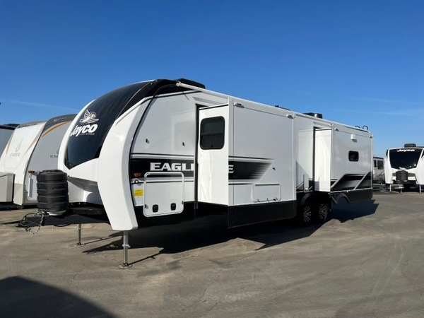 You will feel right at home camping in this travel trailer! It features a front private bedroom with a queen bed slide for more interior space, a dresser, a front wardrobe to hang your clothes, and a wardrobe that is prepped to add an optional washer and dryer. Start each morning getting squeaky clean in the full bathroom with the shower and then head to the kitchen to fry up some eggs on the stainless steel range. The kitchen island will help make meal prepping easier too, plus there is a hutch to store your dishes. Enjoy a relaxing evening by the fireplace and watch your favorite movie with the entertainment center while sitting on either the rear tri-fold sofa or the theater seating!