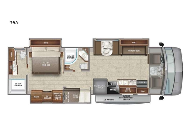This Precept Class A gas motorhome is outstanding because of its two full bathrooms! No one will have to wait to get cleaned up after a day of outdoor fun because you have a 32" x 32" radius shower in one bathroom and a 30" x 36" shower in the other. Plus, the second bathroom is connected to the bedroom creating a delightful master suite. For compact sleeping space, you'll find a set of bunk beds, and the 21-cubic foot residential refrigerator will do an excellent job of providing storage space for all of the food needed to feed everyone. You even have more sleeping space once you fold out the booth dinette and tri-fold sofa. Before bed, you should head outside to sit underneath the 12' electric awning with LED lights and watch the exterior LED TV.