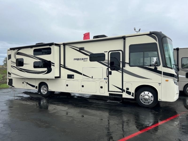 The Jayco Precept Class A gas motorhome comes with some features that you'll only find on a Jayco product, like the JRIDE PLUS which offers you a powerful blend of precise handling and renowned stability on the road and the JAYCOMMAND system powered by Firefly which allows you to control your coach's operations from just about anywhere with your phone. You'll find two-point lap seatbelts in all designated seating locations, and the one-piece, seamless fiberglass front and rear caps resist wear and tear over the years. The Precept also offers you the lightest yet strongest construction in the industry with the Stronghold VBL lamination on the roof, floor, and sidewalls. You'll also be very pleased to find a 120" panoramic windshield (the largest in the industry), automatic hydraulic leveling jacks, an Onan® Marquis Gold Genset 5,500W gas generator with auto-gen start, and a Girard® tankless LP water heater.