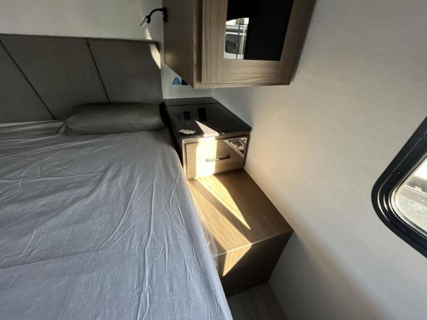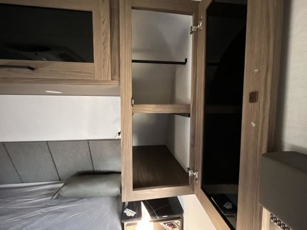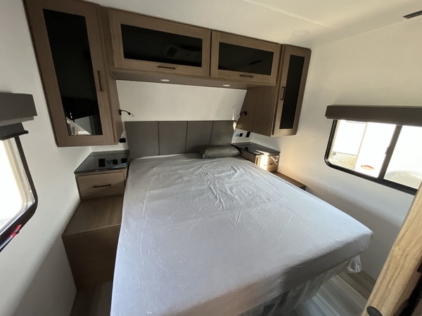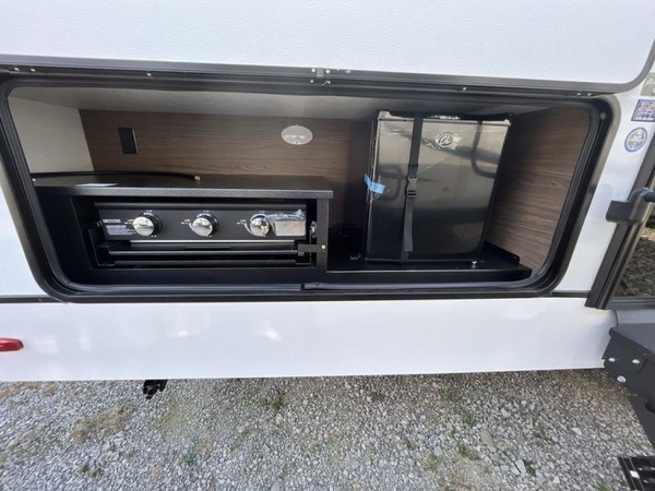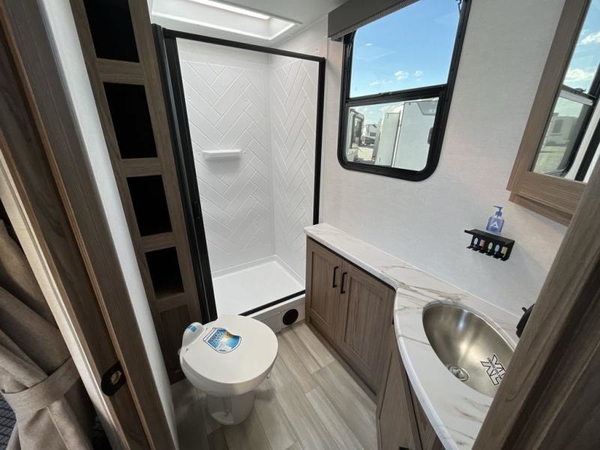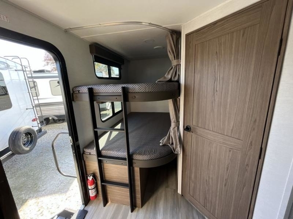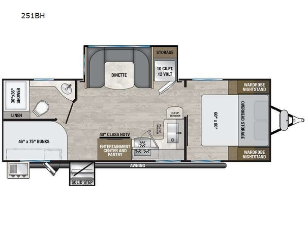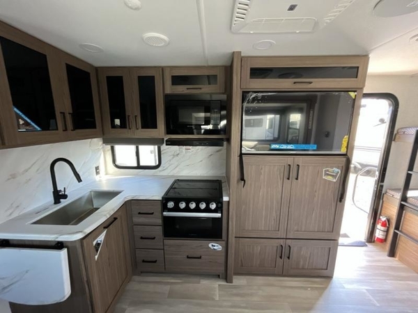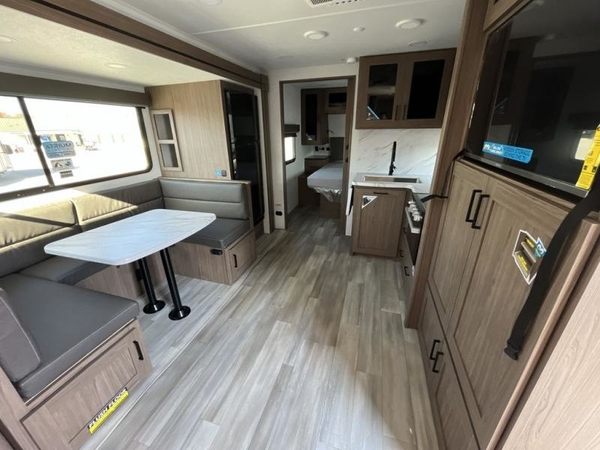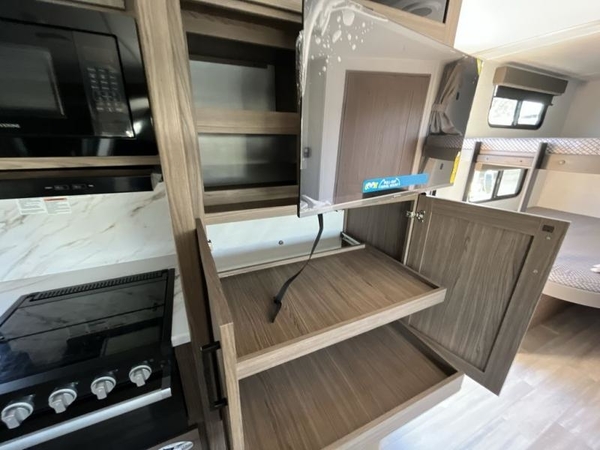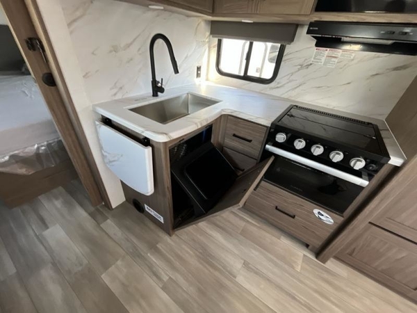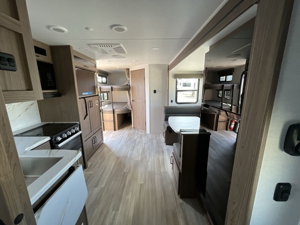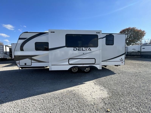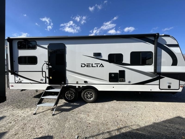 Sleeping for eight is easy in this new Delta travel trailer with a set of 46" x 75" rear corner bunks, a queen bed in the front private bedroom, and also using the U-shaped dinette once converted. The front bedroom features plenty of storage with large overhead cabinets as well as within bedside wardrobes and nightstands for your personal items. You can easily prepare all of your favorite meals and snacks with the kitchen amenities provided. A three burner range allows you to easy cook indoors, or you can enjoy cooking outside using the outdoor griddle/grill if you like. There is a 10 cu. ft. refrigerator to keep all of your perishables and drinks nice and cold, plus a large sink for dishes and cleaning up, as well as a pull-out trash can and flip-up counter extension. You will also appreciate the rear corner bath featuring a 30" x 36" shower, toilet, vanity with sink, and linen cabinet for your towels.