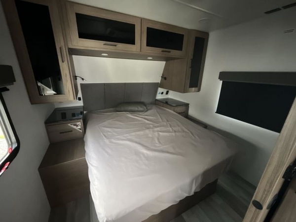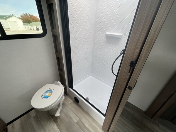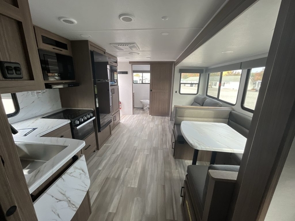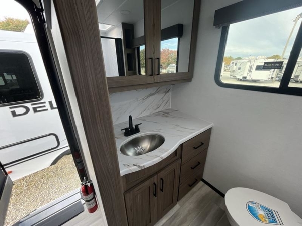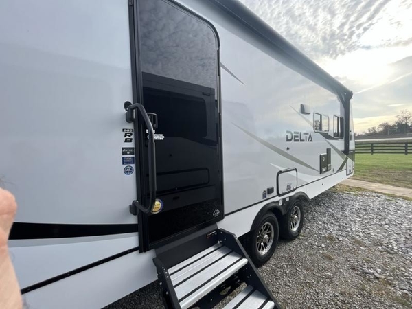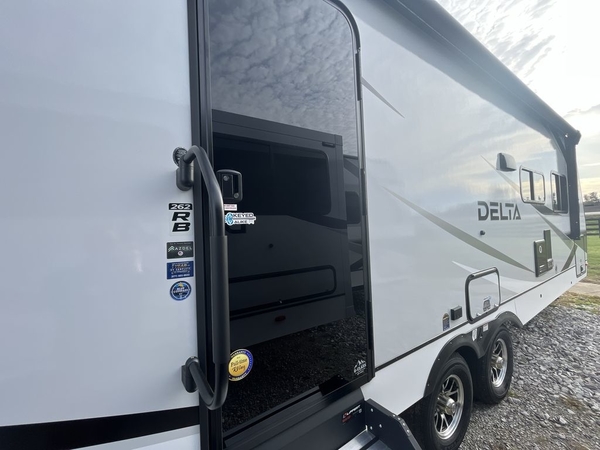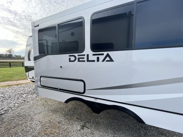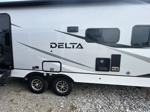 You will love all of your adventures with this Delta travel trailer in tow! This unit is perfect for a couple or even a family of four or six with a queen bed in the front private bedroom, and also using the sofa and U-shaped dinette once converted for more sleeping space. The U-shaped dinette is great for gathering for meals, a board game or game of cards, and the sofa is directly opposite a 40" HDTV which makes viewing enjoyable. You can easily prepare all of your favorite meals and snacks with the kitchen amenities provided inside. A three burner range allows you to easily cook indoors, or you can cook outside using the outdoor griddle/grill if you like. There is a 10 cu. ft. refrigerator to keep all of your perishables and drinks nice and cold, plus a large sink for dishes and cleaning up, and a convenient pull-out trash can and flip-up counter extension as well. You will also appreciate the full rear bath featuring a 30" x 36" shower, toilet, vanity with sink, and linen cabinet for your towels and toiletries.