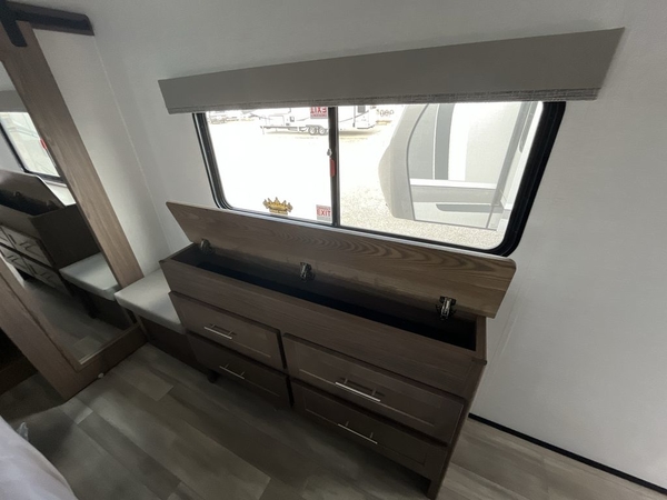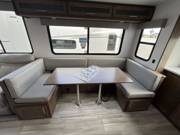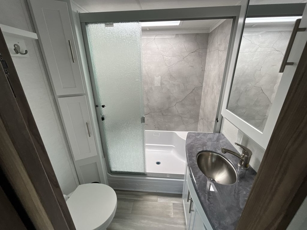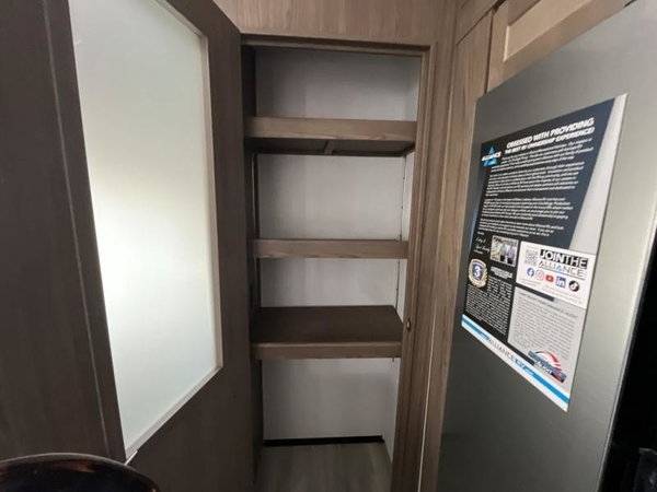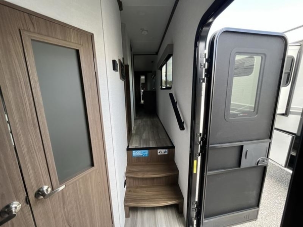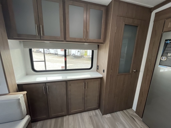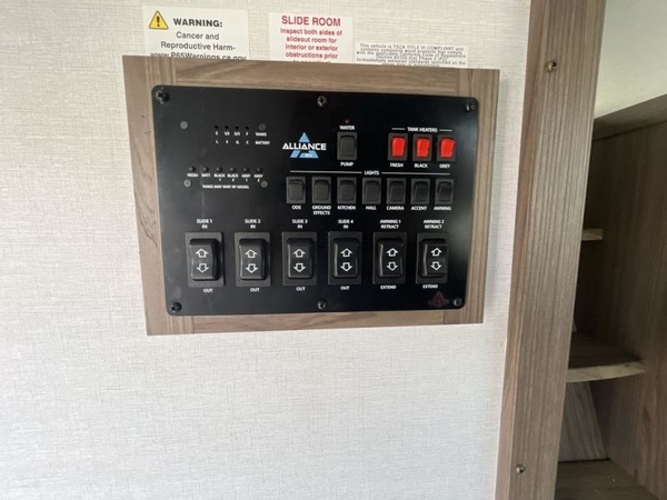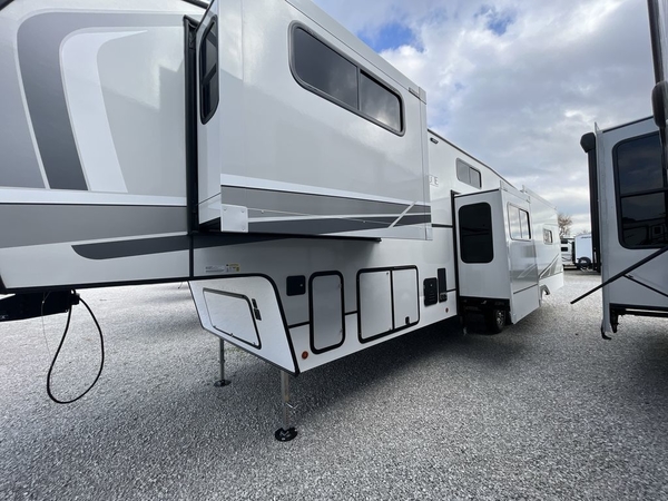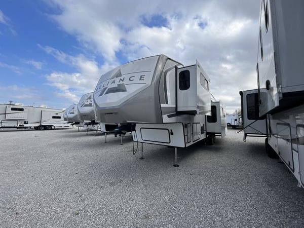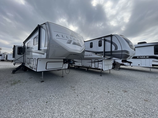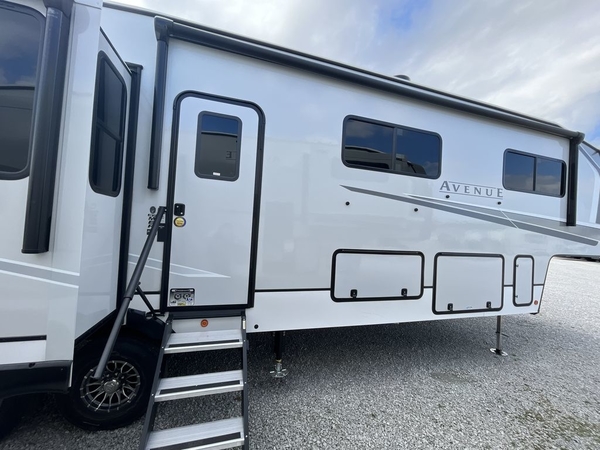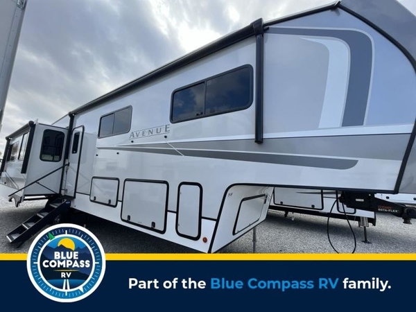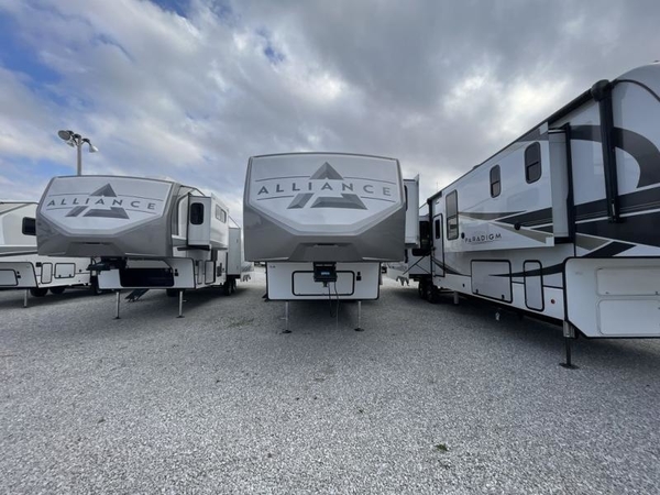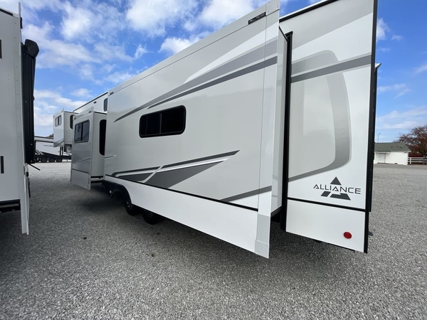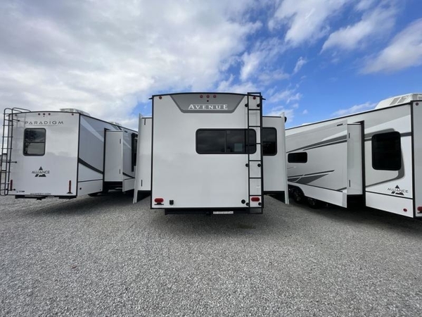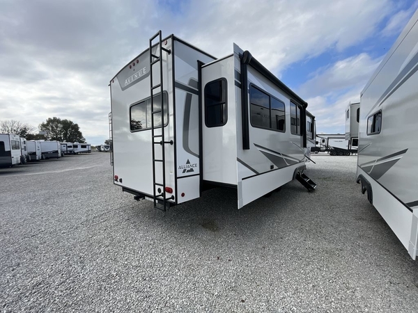 A benchmark chassis creates a space saver upper deck with each one of these Avenue fifth wheels by Alliance RV! The 101 in. wide-body construction gives you more room to walk around and the flush slide out floors throughout prevent any tripping. There are Azdel composite sidewalls inside and out, and a seamless fully walkable PVC roof for extreme durability, zero maintenance, and it is more solar reflective because of the bright white color. Twin 13,500 BTU A/C units provide 27,000 BTUs of cooling power which are ultra quiet and independently controlled keeping you comfortable during your entire trip. And, the fully enclosed and heated underbelly means that you can extend your camping season into the colder months if you like. You are sure to love the "no carpet zone" making each Avenue easy to clean and allergen free, not to mention pet friendly with vinyl flooring throughout. And, strategically placed Atrium windows in the bedroom and living area will not only provide more light, cross ventilation and fresh air, but bring a spectacular view of your surroundings right inside. You can maximize your space throughout with innovative storage solutions like the hidden storage behind the TV, inside the end tables, ottoman, and dinette chairs. Come choose your favorite model today!