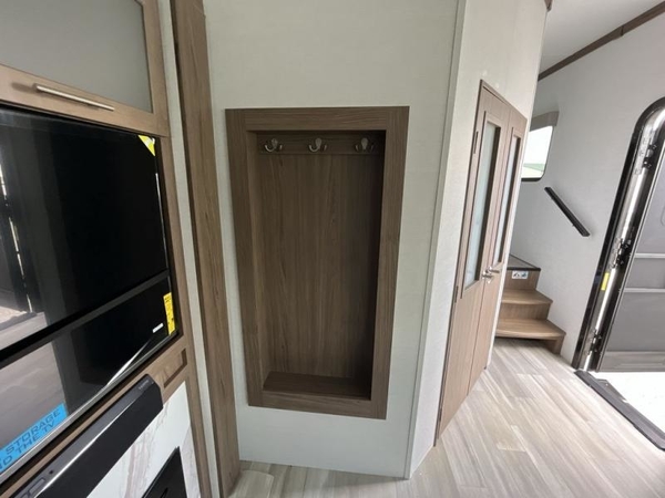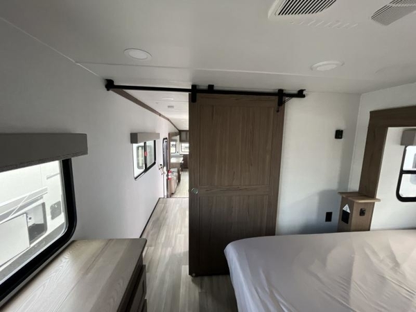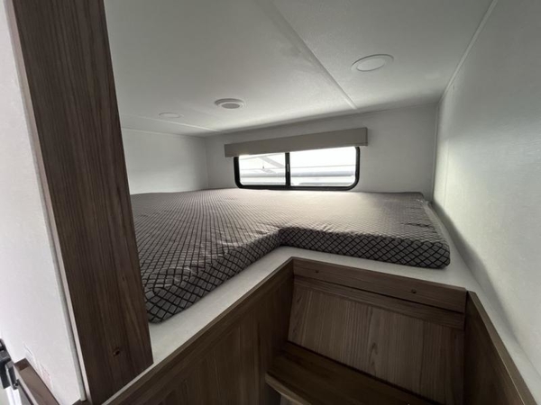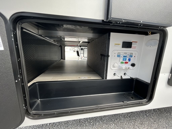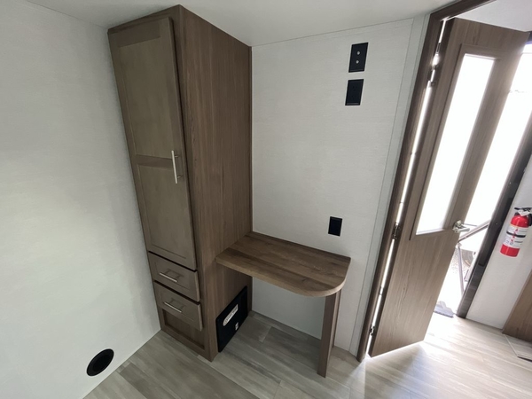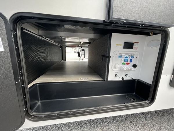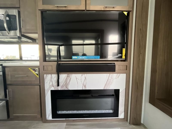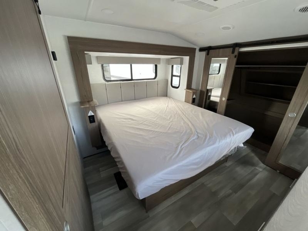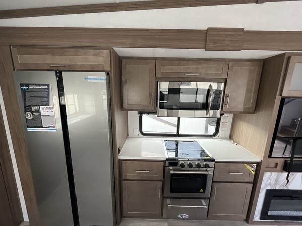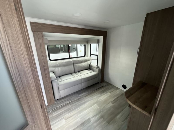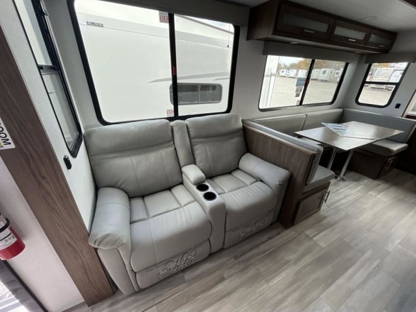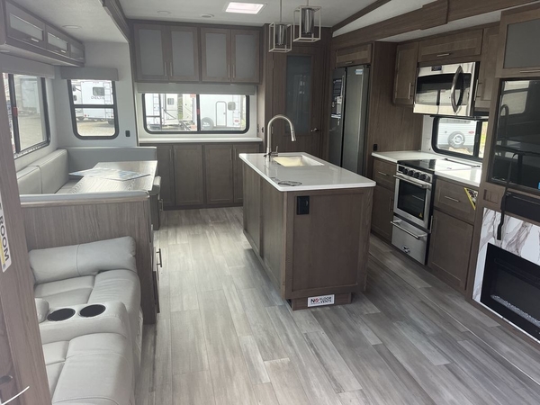 This fifth wheel is packed full with comfortable features! The front private bedroom has a queen bed slide that can be switched out for an optional king bed, a dresser, and a front wardrobe that is prepped to add an optional washer and dryer. Freshen up each morning in the full bathroom with a 30" x 50" shower then head to the full kitchen to prepare breakfast with the kitchen island and three burner cooktop. The second bedroom has a sofa slide with a loft above it all. Relax each night on the dual recliner theater seating across from the swing mount 50" HDTV with hidden storage behind it or play a few games at the U-shaped dinette. This model also has the option to switch out the U-shaped dinette for an optional floating dinette table beside the theater seat. You also have an outside refrigerator and outside griddle by a flip-up baggage door for storage!